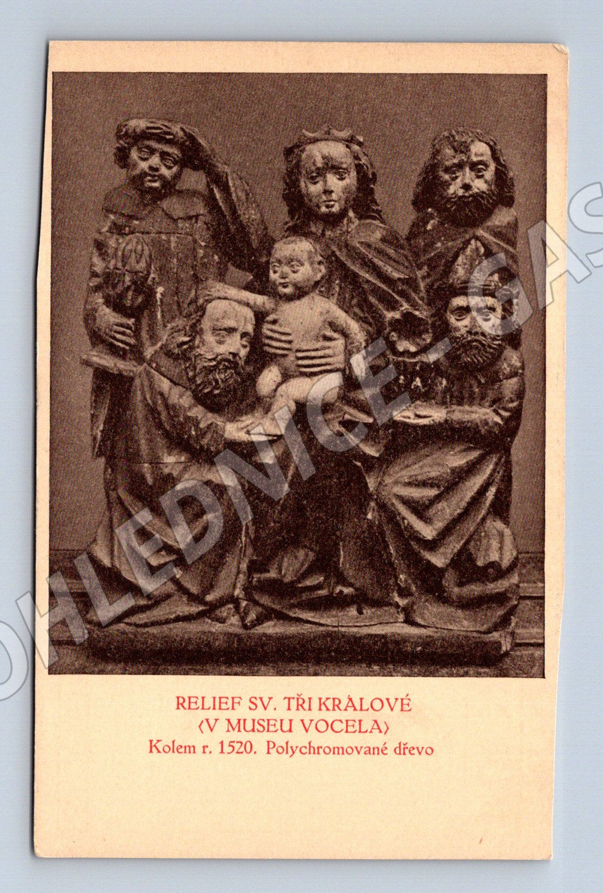 Originální pohlednice z České republiky, malý formát, vydaná před rokem 1950. Na přední straně je černobílý tisk reliefu sv. Tří králové uchovávaného v Museum Vocel v Kutné Hoře. Relief je datován kolem roku 1520 a je vyroben z polychromovaného dřeva. Z rubu je uvedeno: Kutná Hora I. Dopisnice , vydal Nakladem Nové Edice, Praha II., Žitná 10. Ve velmi dobrém stavu, vhodné pro sběratele historických pohlednic a milovníky umění a historie Kutné Hory.