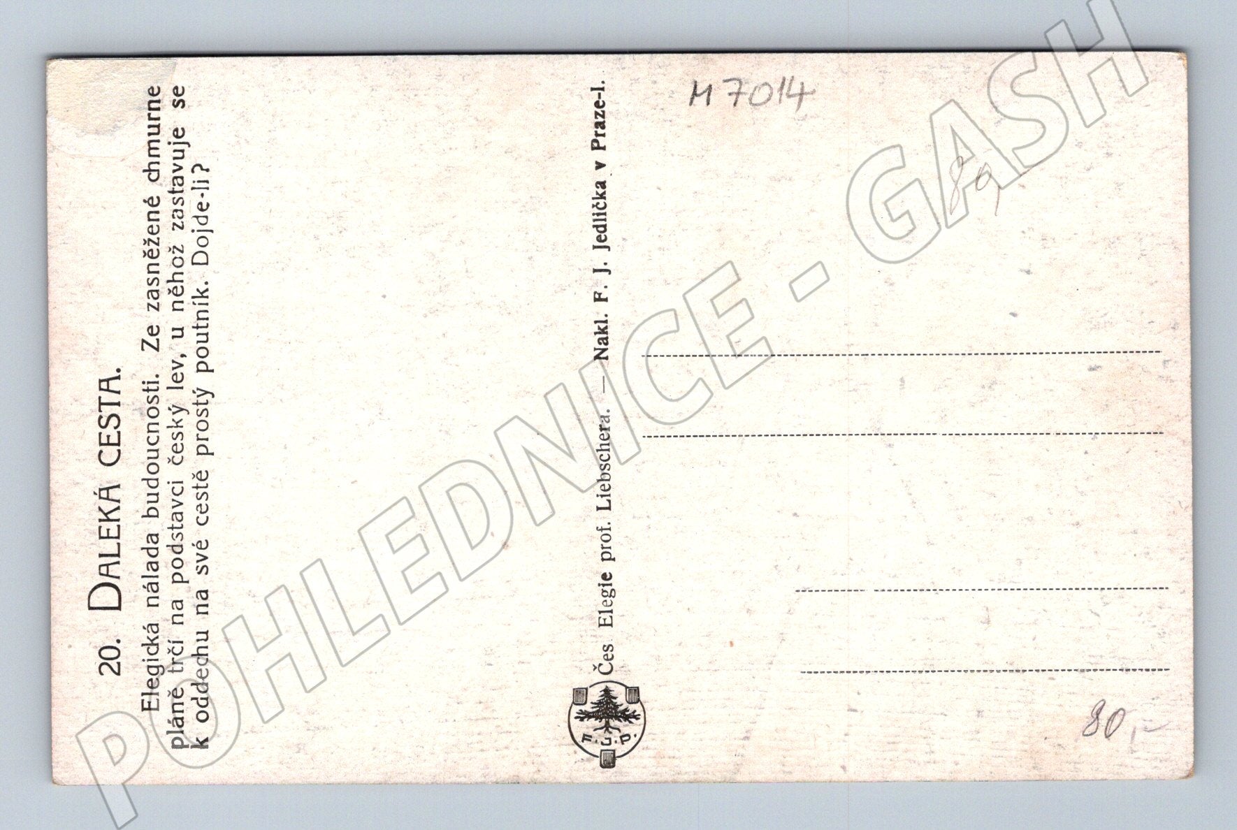 Starší pohlednice s uměleckým motivem od F. J. Jelínka vydaná nakladatelstvím F. J. Jedlička v Praze. Pohlednice je součástí série Elegie prof. Liebschera a nese název Daleká cesta . Na přední straně je vyobrazen poutník a ležící lev na podstavci, malba evokuje elegickou náladu budoucnosti. Na zadní straně pohlednice je krátký popis v češtině a prostor pro adresu a text. Formát pohlednice odpovídá malému formátu, bez známky či razítka, vhodná pro sběratele uměleckých pohlednic i zájemce o české výtvarné umění.