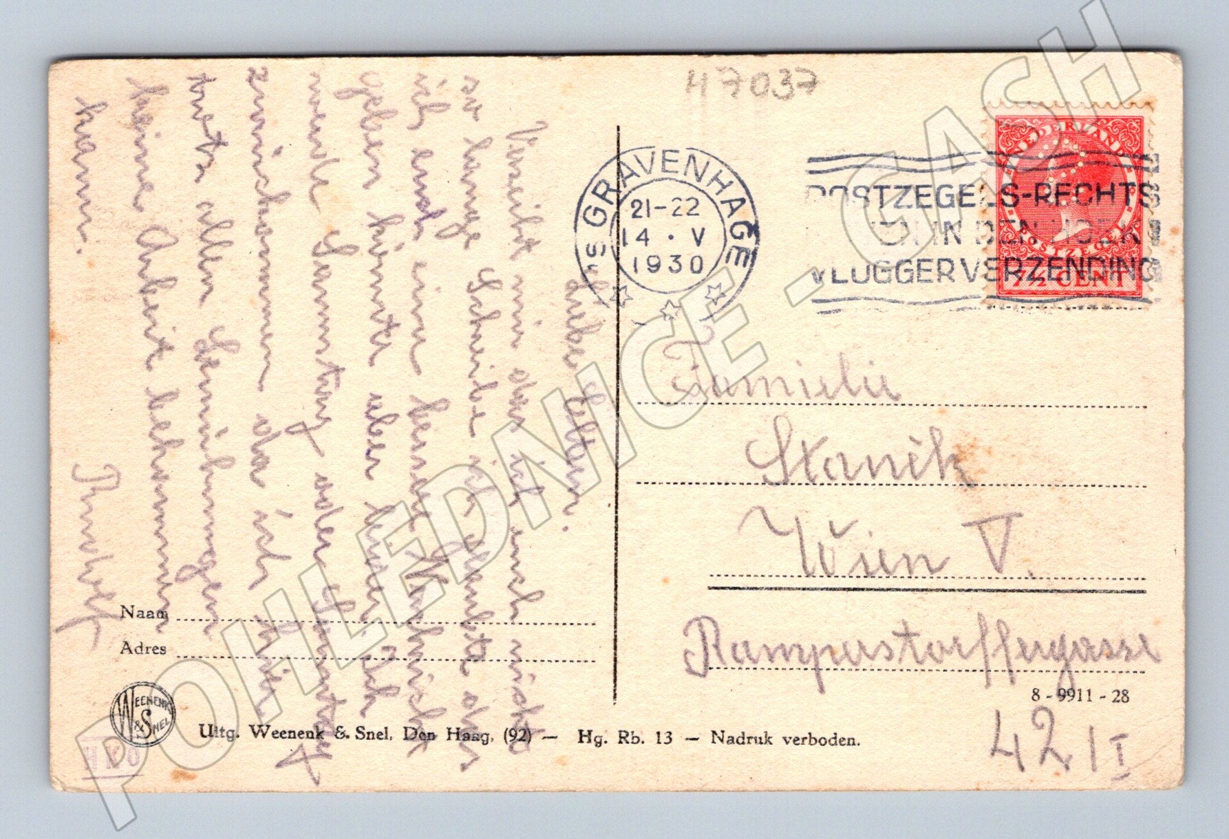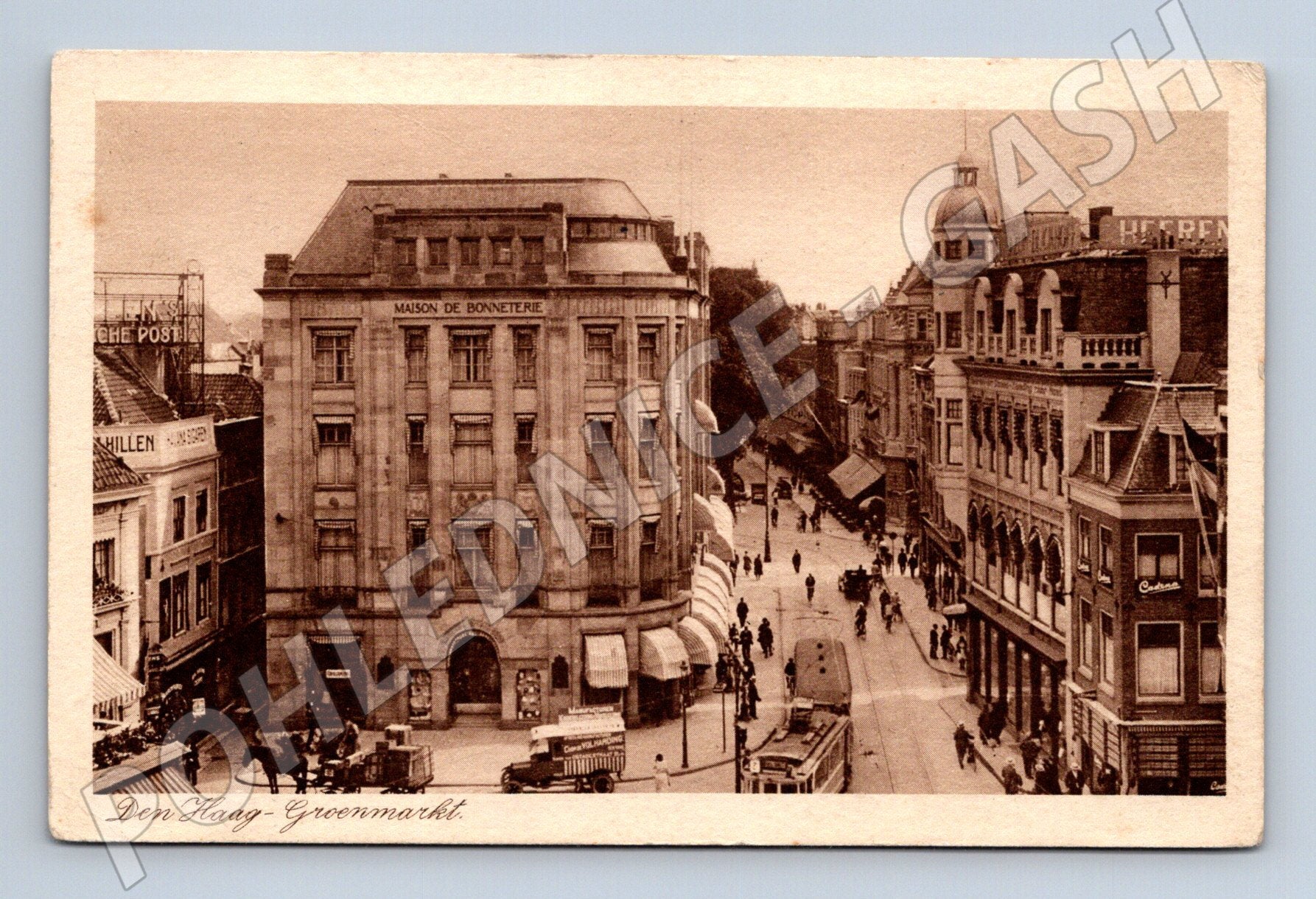 Starobylá pohlednice z roku 1930 zobrazující Den Haag (Haag), konkrétně známý Greenmarkt s tramvají a historickými budovami jako Maison de Bonneterie. Pohlednice byla použita a odeslána, což je patrné z razítka a známky z Nizozemska. Na rubu je čitelný rukopis a adresní pole. Perfektní sběratelský kousek s vysokou historickou a filokartistickou hodnotou, vhodný pro milovníky starých pohlednic, městských motivů a dopravy. Poklad pro každého sběratele pohlednic s evropskou tematikou. Obsahuje známku i poštovní razítko.