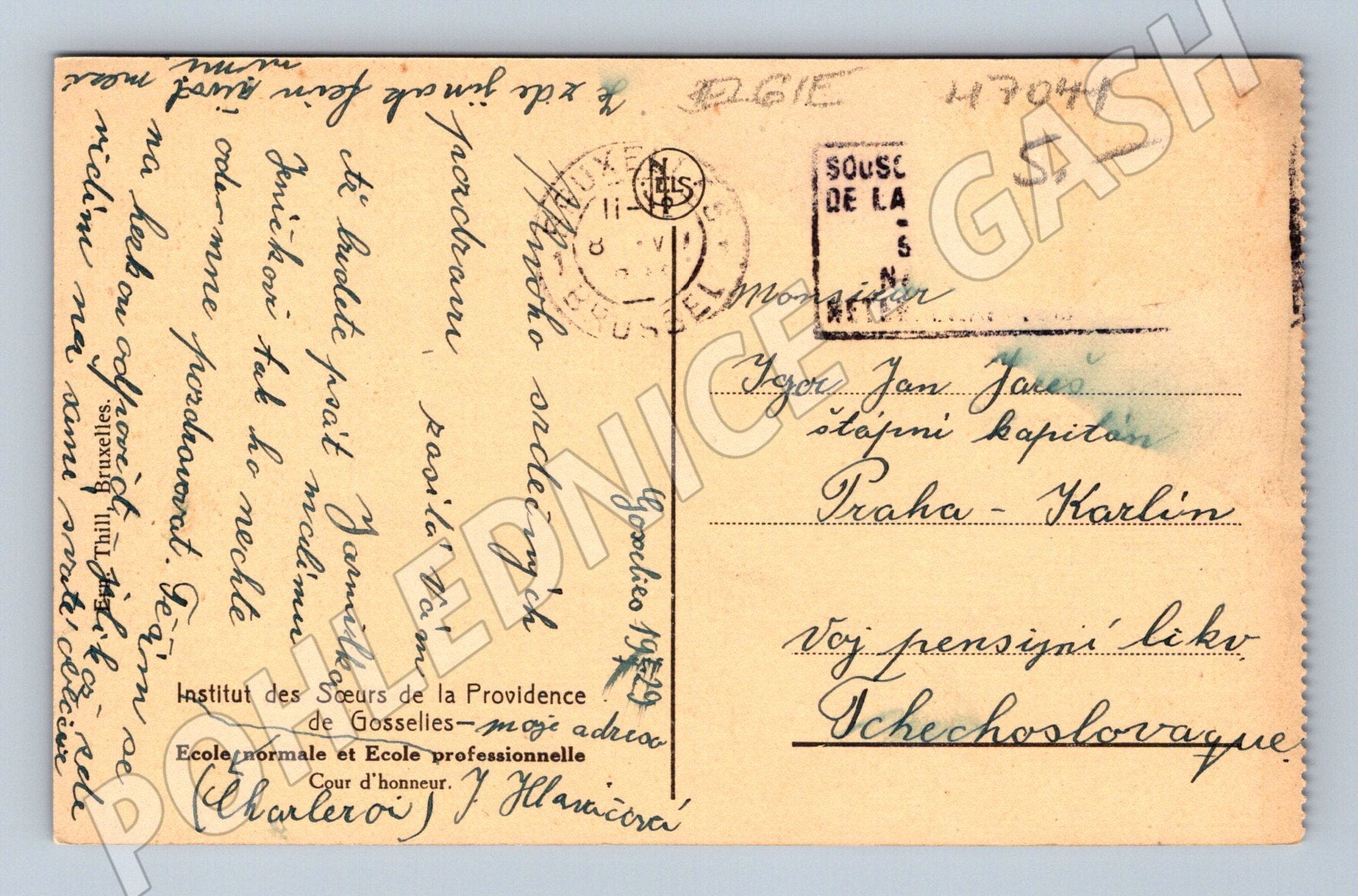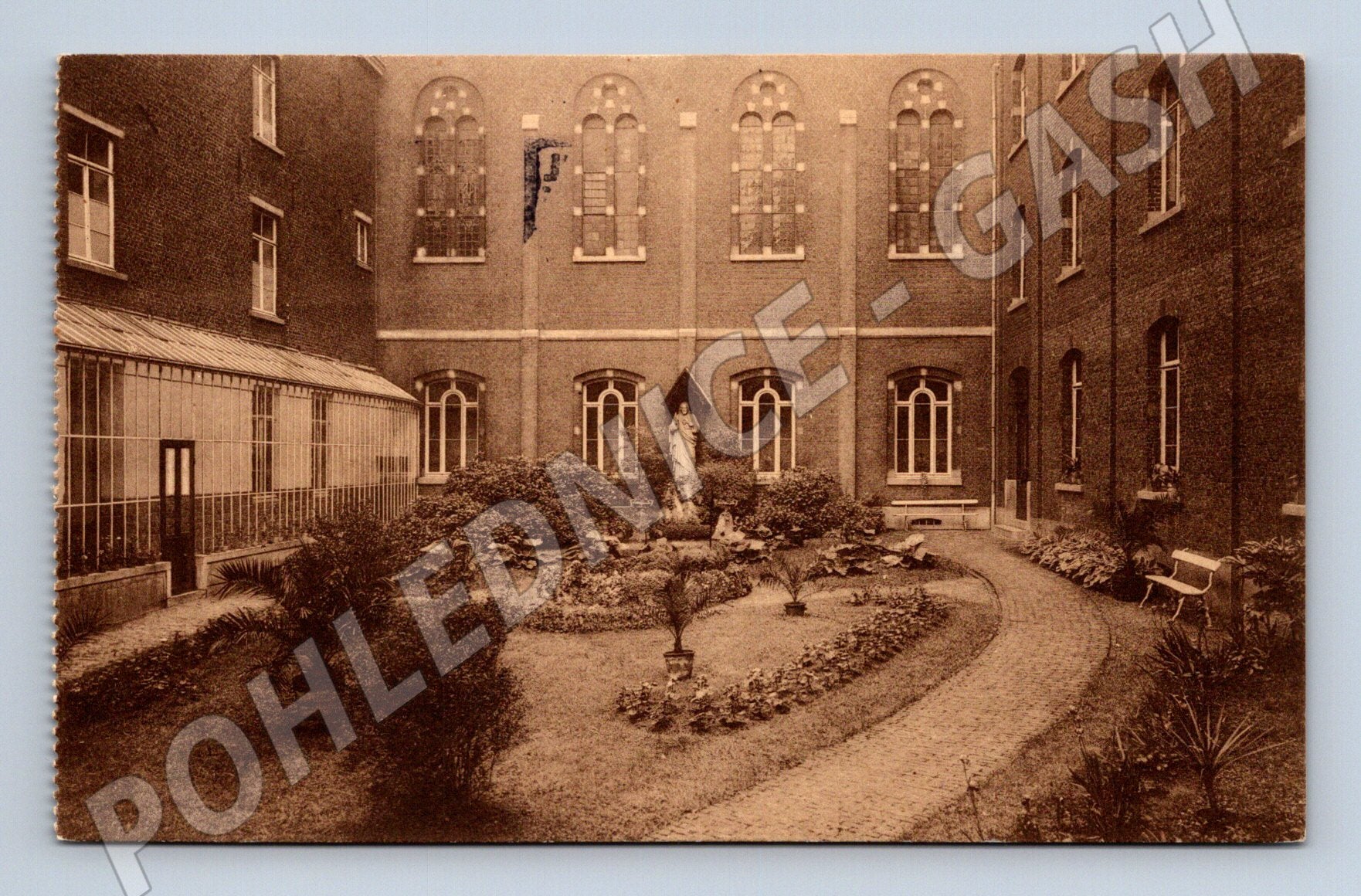 Nabízím starou pohlednici z období první poloviny 20. století s motivem dvora institutu Institut des Soeurs de la Providence de Gosselies v Belgii (Charleroi, Belgie). Pohlednice zachycuje nádvoří s květinovou výsadbou, sochou a skleníkem, typicky klášterní a školní architektura. Na zadní straně je ručně psaný text ve francouzštině, odesláno do Československa (Praha-Karlín), a sběratelská razítka. Velmi zajímavý exponát pro milovníky historických pohlednic, klášterních staveb i zahradní architektury. Stav viz foto, rohy lehce opotřebované, dobová patina. Nevšední evropské téma z Belgie!
