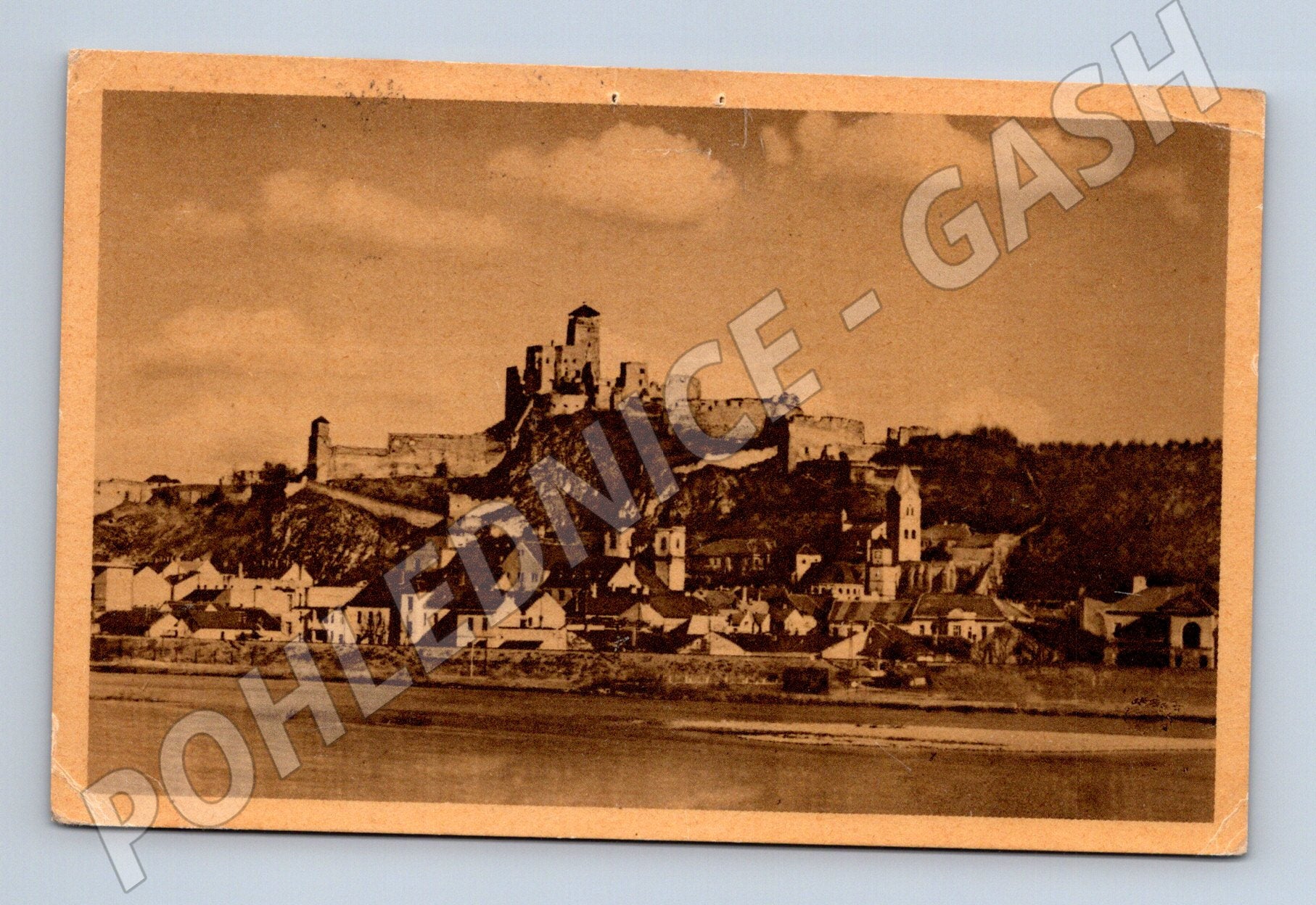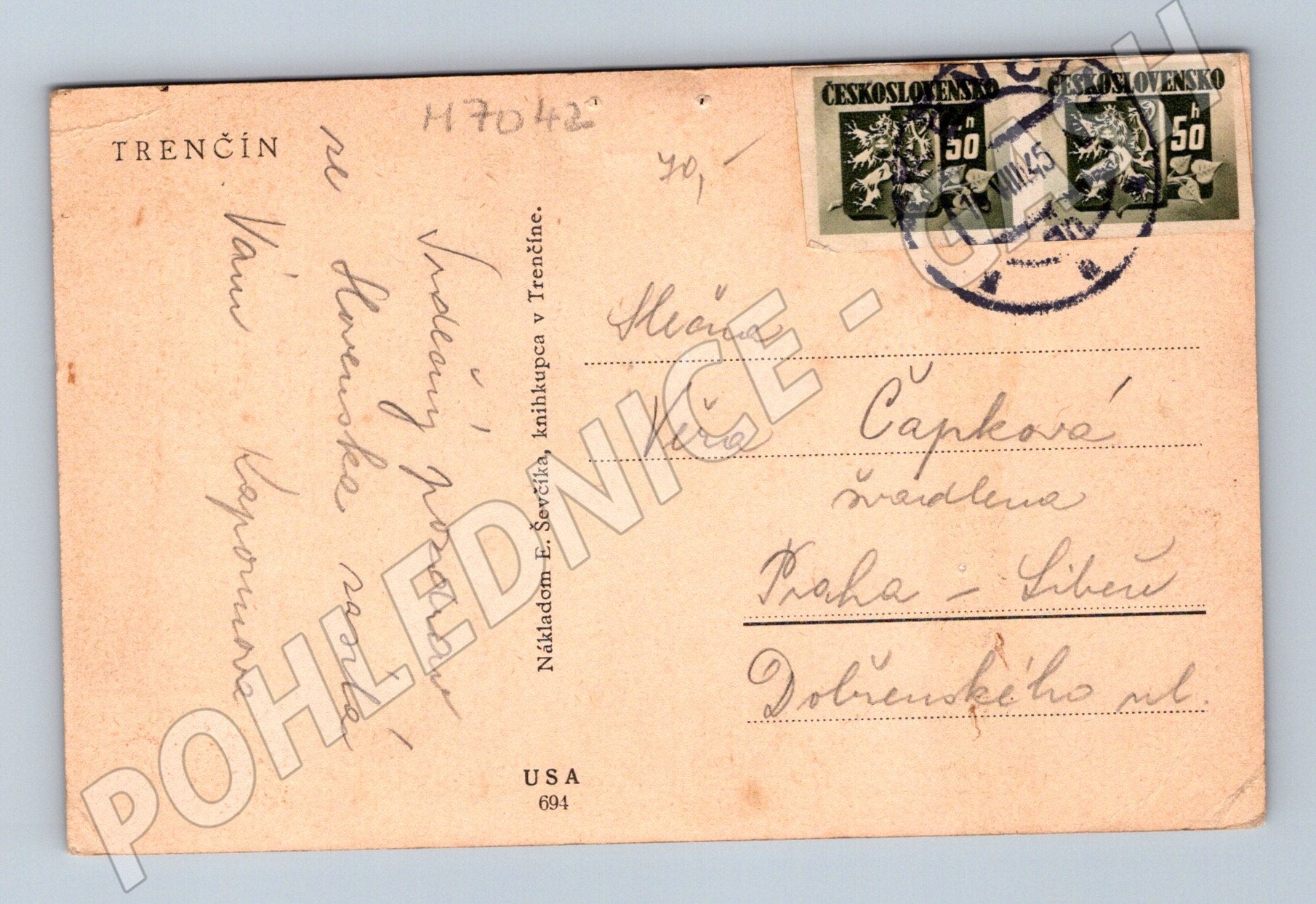 Trenčínský hrad – stará pohlednice, rok 1945, se známkou