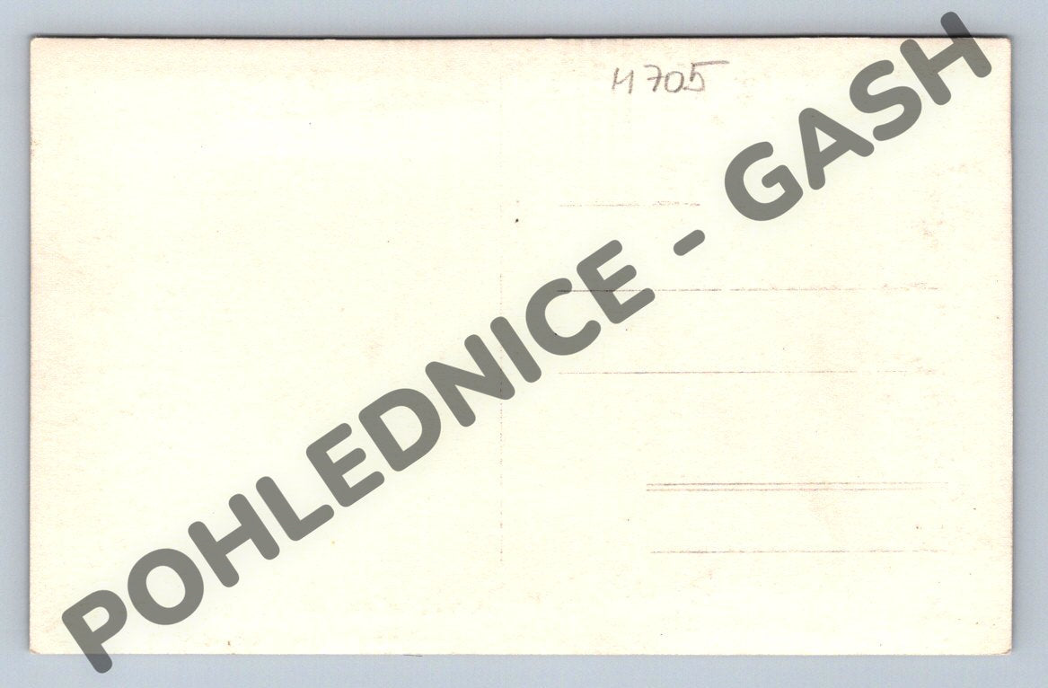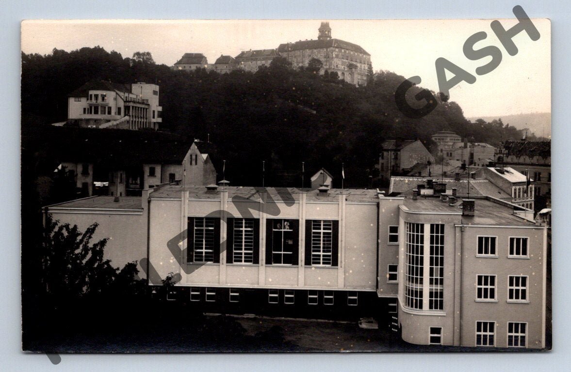 Nabízím starou černobílou pohlednici zobrazující zámek v pozadí na kopci s modernějšími budovami v popředí. Fotografie zachycuje zajímavý kontrast historické architektury a novějších staveb, pravděpodobně z první poloviny 20. století. Pohlednice je v hezkém stavu bez větších poškození, vhodná pro sběratele starých pohlednic a milovníky historie architektury.