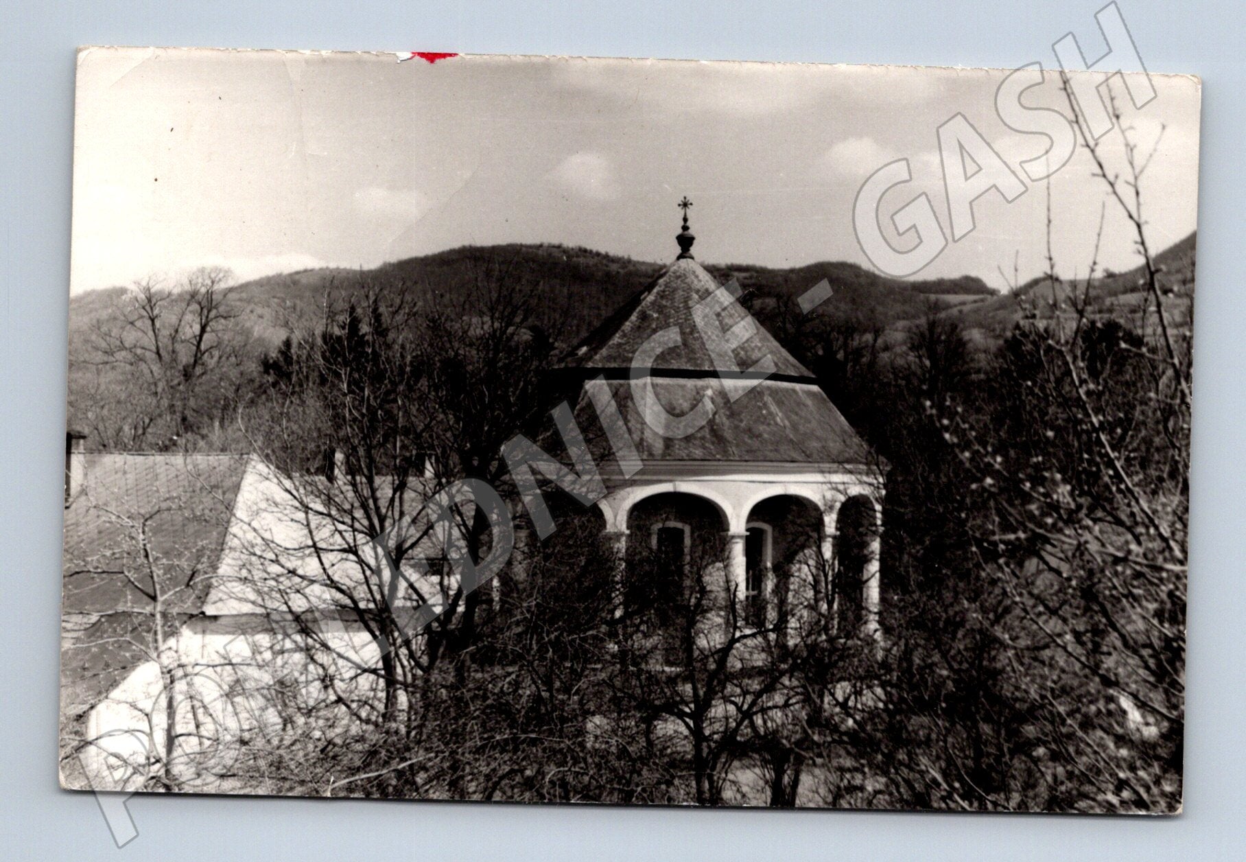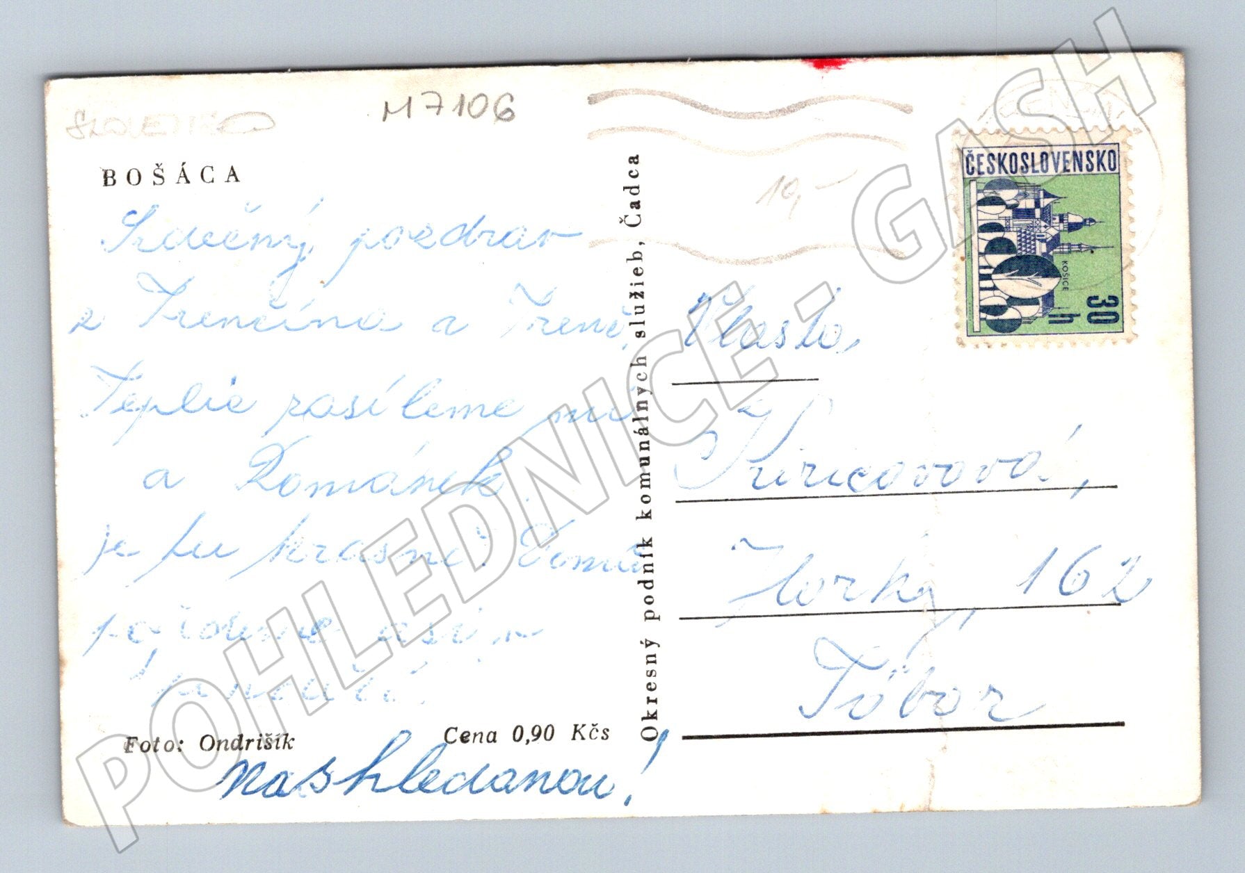 Originální černobílá pohlednice z obce Bošáca na Slovensku. Na přední straně je vyobrazena historická stavba s kopulovitou střechou a okolní přírodou v pozadí. Pohlednice byla odeslaná, zachovalá s ručně psaným textem i původní známkou Československo (30 h). Fotograf: Ondrišík. Rozměr pohlednice odpovídá malému formátu (před 1950). Skvělý sběratelský kousek pro milovníky slovenské historie a pohlednic ze starých časů. Stav velmi dobrý, bez výrazného poškození, pouze drobné známky stáří na okrajích.