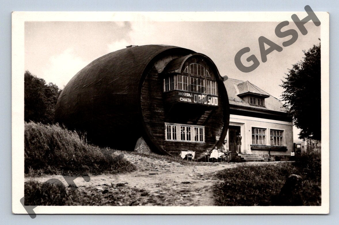 Nabízím k prodeji starou černobílou pohlednici zachycující Horskou chatu Obří sud v lázních Libverda. Tato unikátní chata, postavená ve tvaru obřího sudu, je významnou památkou turistické architektury v České republice a je ikonou regionu Liberecka. Pohlednice je malého formátu, pochází z období do roku 1950, je v dobrém stavu, bez výrazných poškození. Na zadní straně je vytištěn název místa „Lázně Libverda a místo pro známku a adresní údaje. Skvělý sběratelský kousek pro milovníky historie, architektury a cestovního ruchu v ČR.