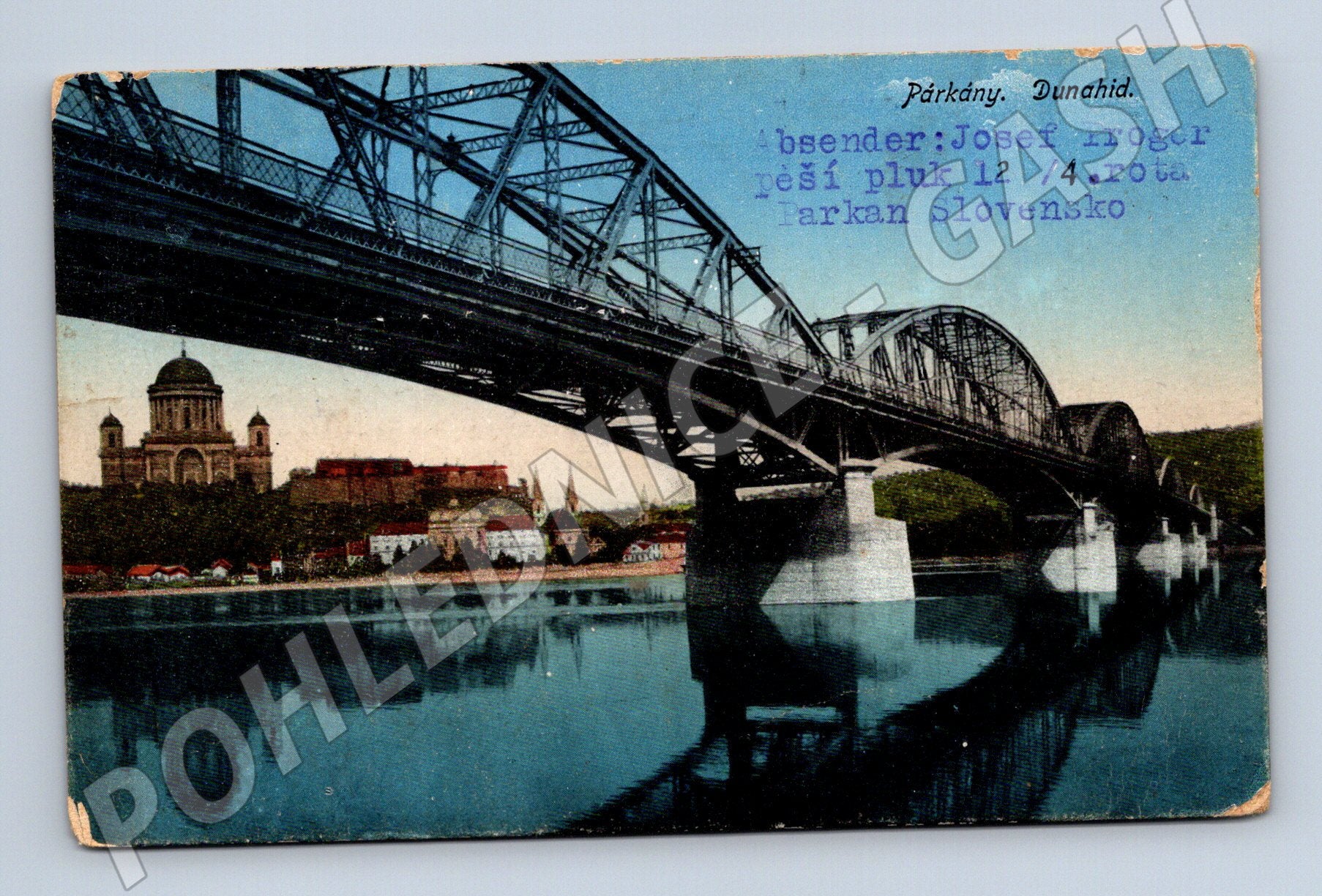 Historická pohlednice zobrazující ikonický železniční most přes Dunaj mezi městy Párkány (dnes Štúrovo na Slovensku) a Ostrihom v Maďarsku. Na pohlednici je krásně kolorovaný pohled na ocelový most s bazilikou v pozadí. Zadní strana obsahuje dobový text psaný na stroji, poštovní známku Československé pošty a razítko s datem 16. X. 18. Pohlednice je v dochovaném, mírně opotřebeném stavu, ideální k rozšíření sbírky historických pohlednic s tematikou železniční dopravy a architektury. Unikátní doklad historie i dobové korespondence z období konce první světové války.