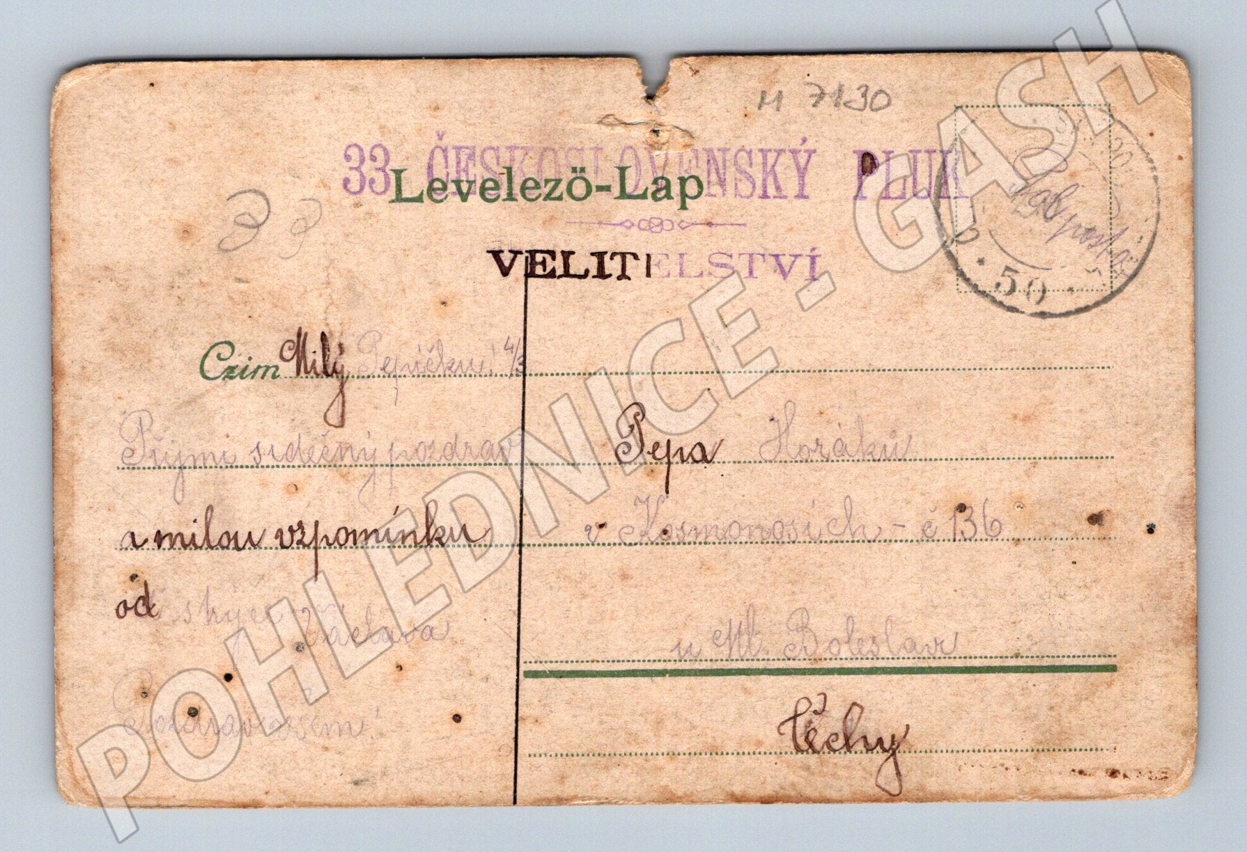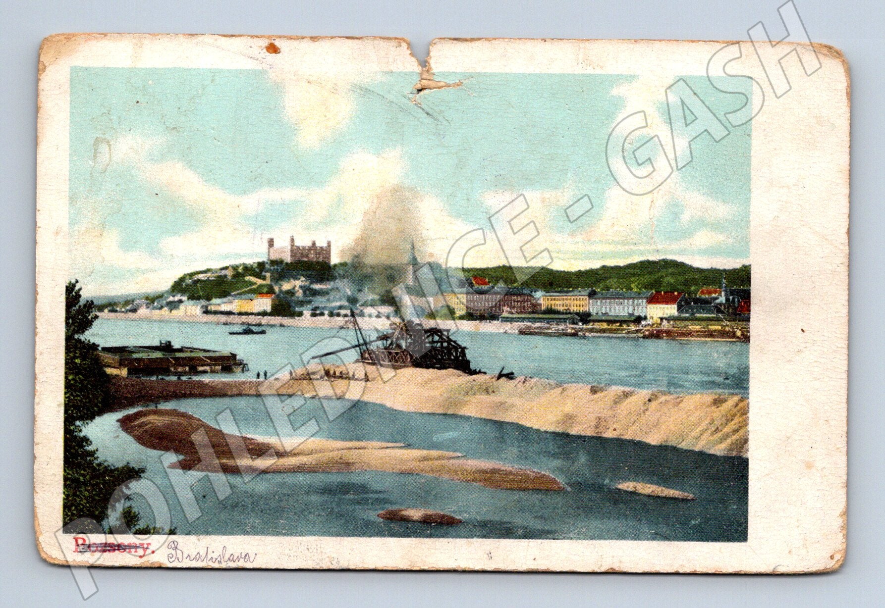 Starobylá pohlednice z počátku 20. století zobrazující Bratislavu s výraznou dominantou – Bratislavským hradem v pozadí a pohledem na řeku Dunaj. Pohlednice je malého formátu a byla odeslána v době Rakousko-Uherska, což dokládají dobové poštovní razítka a armádní štábní razítko na zadní straně. Na přední straně je kolorovaný obrázek. Vzácná sběratelská položka vhodná zejména pro sběratele pohlednic se slovenskou tématikou nebo milovníky historie. Stáří i patina odpovídají originálnímu stáří – pohlednice nese známky opotřebení. 33 ČESKOSLOVENSKÝ PLUK VELITELSTVÍ POLNÍ POŠTA FELDPOST DĚLOSTŘELECKÝ PLUK