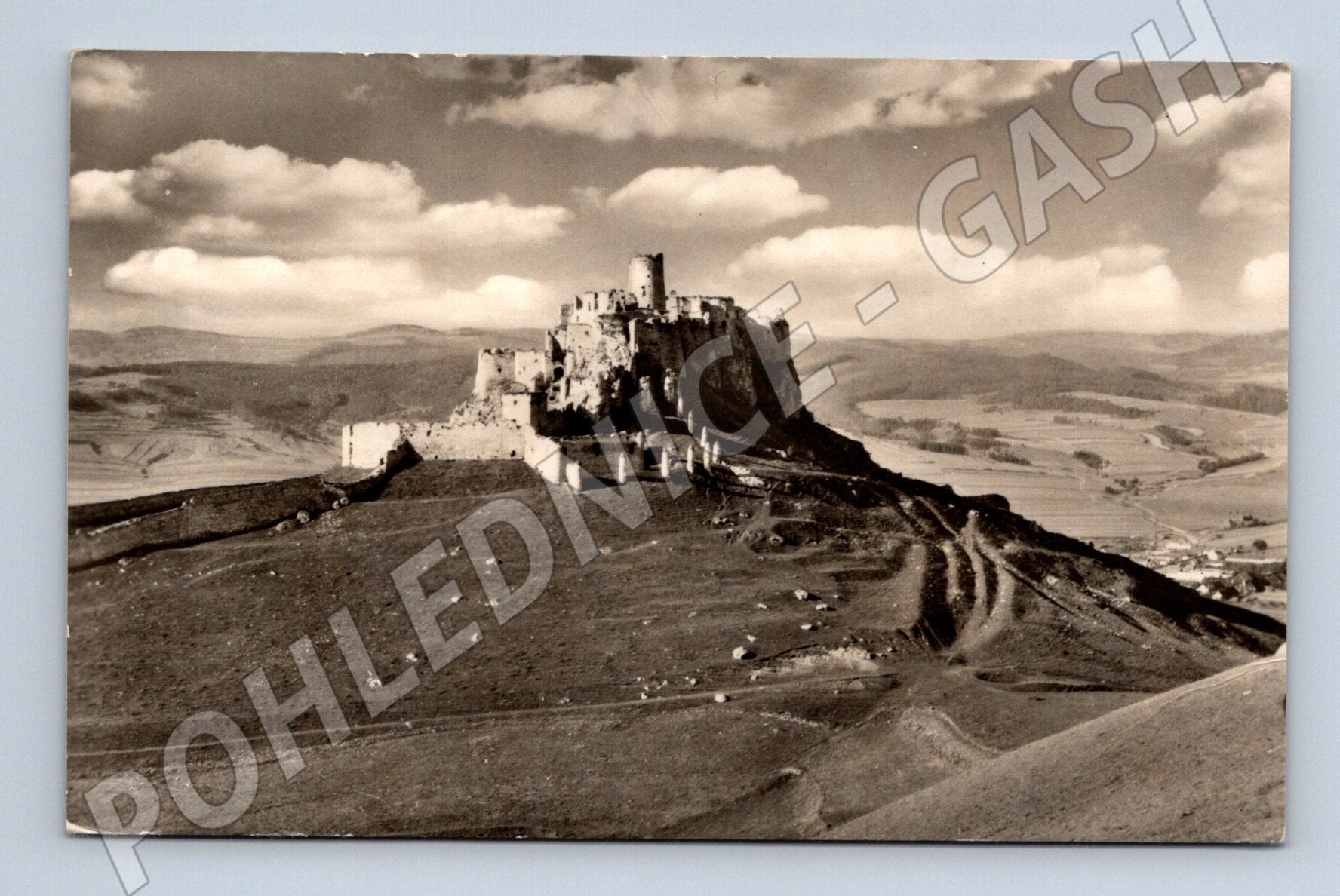 Nabízím originální starou pohlednici s motivem Spišského hradu. Pohlednice je černobílá, v krásné kvalitě, nezachycuje jen monumentální hradní komplex, ale také širší okolní krajinu s typickým reliéfem Spišské oblasti. Na zadní straně je uveden název Spišský hrad a standardní prostor pro poštovní známku a adresu. Pohlednice není popsána a je ve velmi dobrém stavu bez výrazných známek poškození. Vhodné pro sběratele historických pohlednic nebo milovníky slovenských památek.