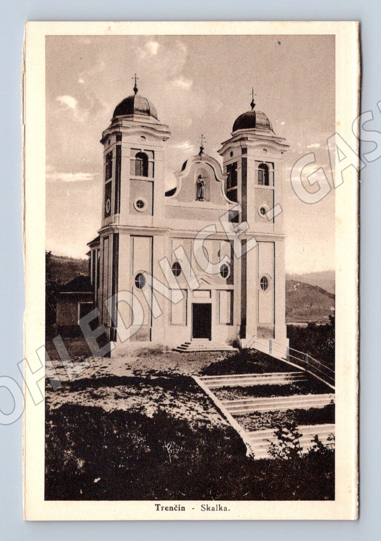 Originální stará pohlednice zobrazující poutní místo Skalka u Trenčína na Slovensku. Černobílá pohlednice zachycuje historickou architekturu barokního kostela v malebné krajině. Na zadní straně je viditelné standardní rozdělení pro adresu a zprávu, pohlednice je nepopsaná a neprošla poštou. Vydavatel Max Fried, Trencsén, číslo 172. Celkově velmi pěkný stav s mírnými stopami stáří a drobným zašpiněním v rozích. Ideální do sbírky slovenských pohlednic s regionální tématikou, zejména předválečné produkce.