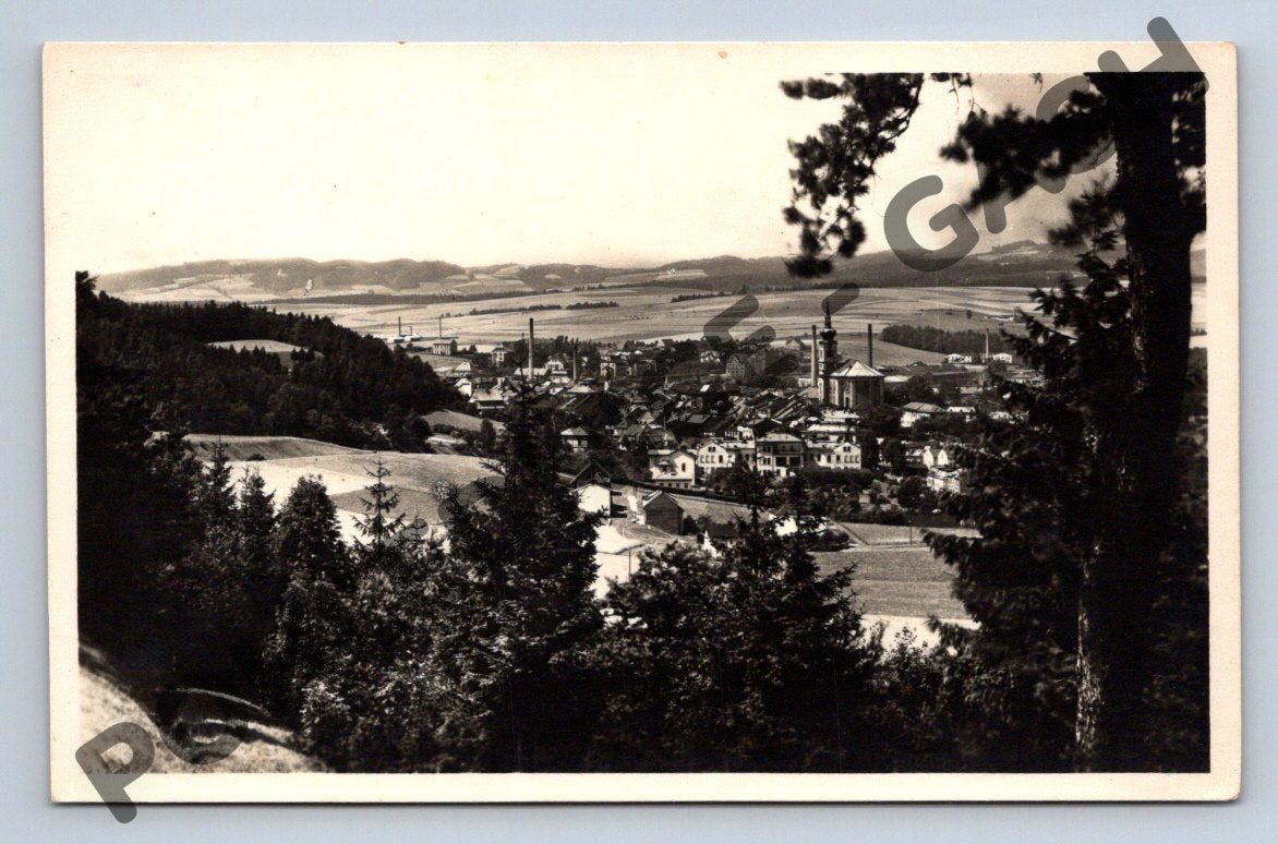 Tato černobílá pohlednice zobrazuje malebný panoramatický pohled na město Trutnov v České republice, viděné z vyvýšené lesnaté oblasti. Pohlednice pochází z první poloviny 20. století, což dokládá její menší formát a černobílá fotografie. Na pohlednici jsou patrné středověké a starší městské budovy, včetně dominanty města - kostela, který se tyčí nad okolní zástavbou. Pohled je doplněn o rozlehlou krajinu v pozadí. Pohlednice je v dobrém stavu, bez výrazných poškození. Na zadní straně je vytištěn text Trutnov a razítko vydavatele Grafo Čuda, Holice. Ideální sběratelský kousek pro milovníky starých pohlednic z českých měst a regionů.