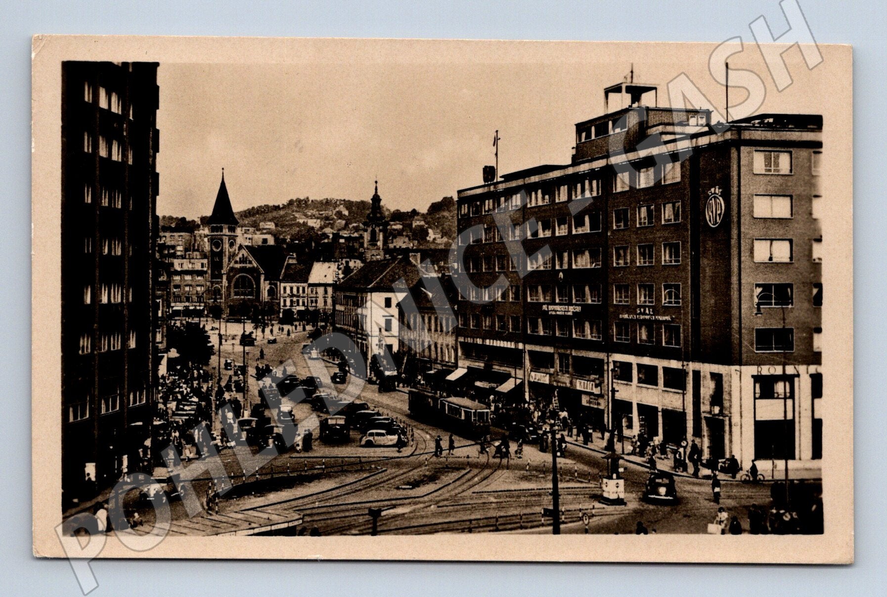 Originální historická pohlednice zobrazující centrální část Bratislavy – Stalinovo náměstí (dnes Náměstí SNP), odeslaná v roce 1947. Pohlednice zachycuje rušné městské dění s tramvajovými kolejemi, dobovou automobilovou dopravou a výraznou architekturou včetně známých budov a okolní krajiny. Zadní strana je vyplněna ručně psaným osobním vzkazem, opatřena dobovou známkou a poštovním razítkem Bratislava 1947. Velmi zajímavý kousek pro sběratele pohlednic Slovenska nebo zájemce o historické městské motivy. Stav odpovídá stáří, viz foto.