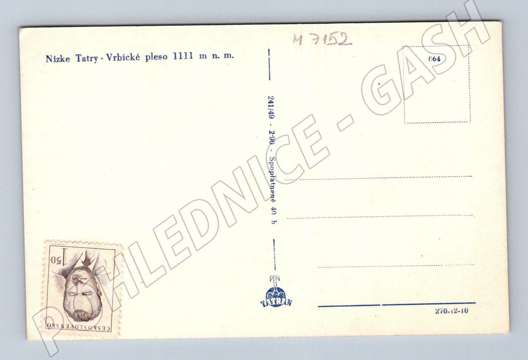 Černobílá pohlednice ze Slovenska zachycující zimní pohled na Vrbické pleso v Nízkých Tatrách (nadmořská výška 1111 m.n.m.). Pohlednice je rámována zasněženými stromy a v pozadí je částečně vidět horská stavba. Na zadní straně je natištěn popis Nízke Tatry - Vrbické pleso 1111 m n. m. , stará známka ČSR a razítko. Originální kousek pro sběratele historických slovenských pohlednic. Stav viz foto.