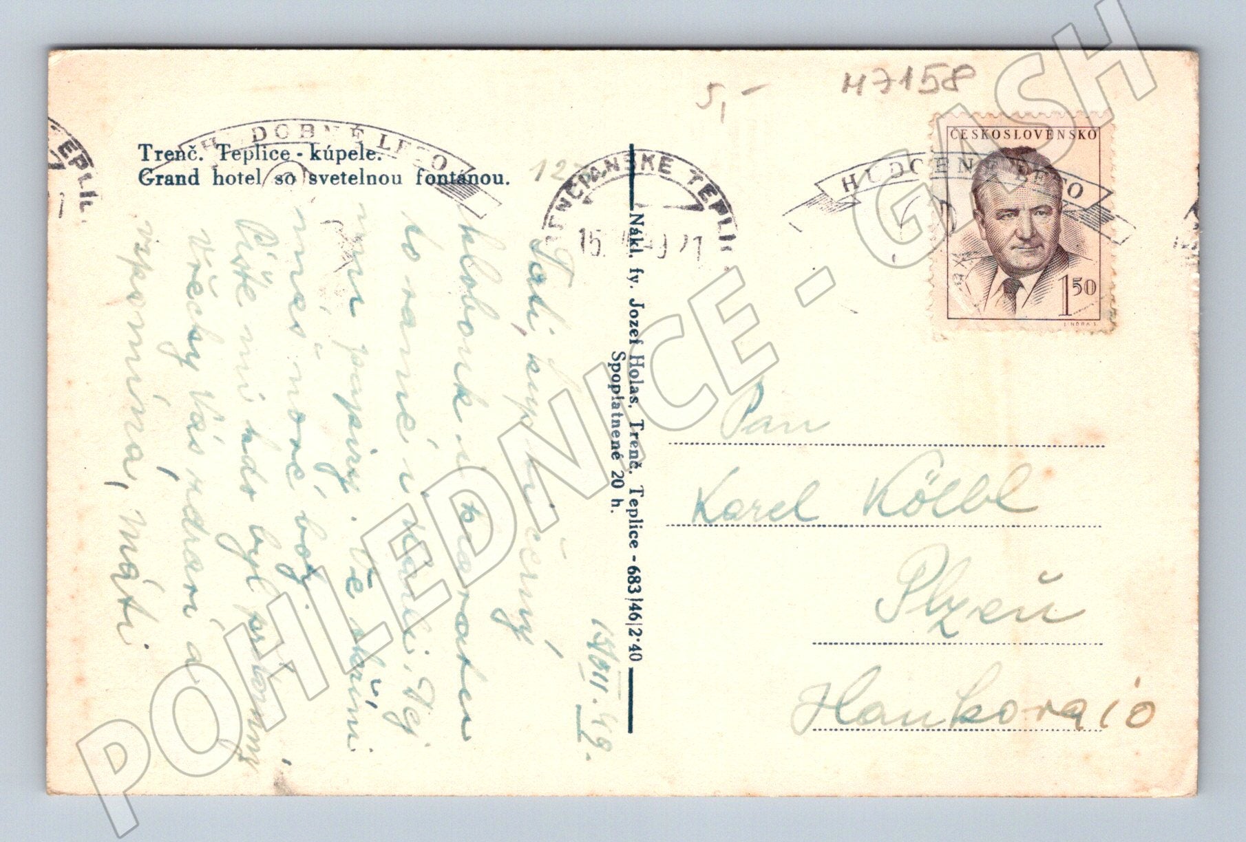 Originální stará pohlednice zobrazující Grand Hotel v Trenčianských Teplicích. Na pohlednici je krásně zachycen pohled na monumentální fasádu hotelu a fontánu před vchodem. Jedná se o černobílou pohlednici menšího formátu z období první poloviny 20. století. Na zadní straně je ručně psaný text, poštovní známka a razítko. Pohlednice byla zaslána do Plzně. Výborný sběratelský kousek pro milovníky historie a architektury lázeňských měst. Stav odpovídá stáří - viz foto.