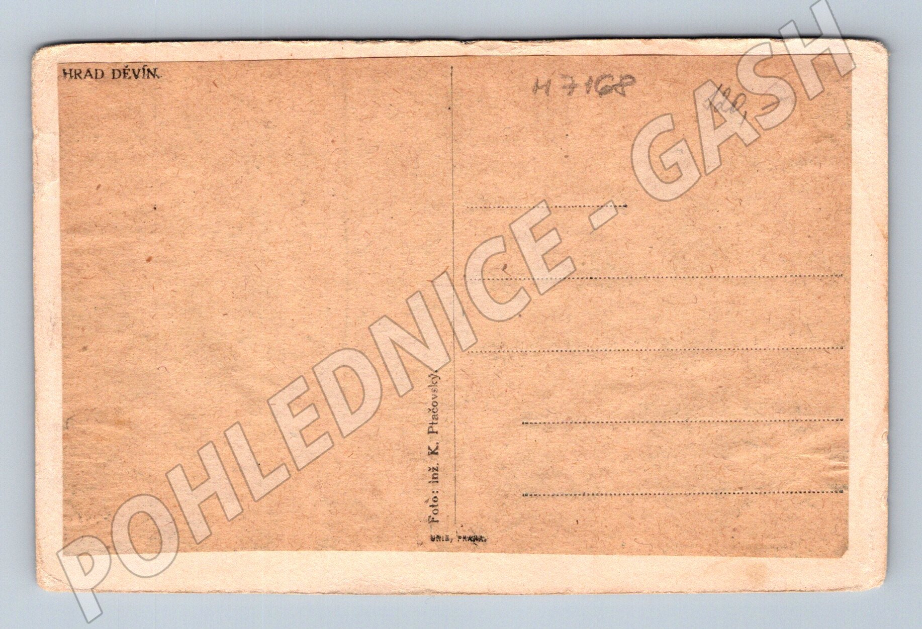 Originální stará pohlednice s motivem slavného hradu Devín. Na černobílé fotografii je vidět panoráma hradu tyčícího se na skále s pasoucím se stádem krav v popředí. Pohlednice je v dobrém sběratelském stavu, místy jsou patrné známky stáří (lehké opotřebení rohů a okrajů). Na zadní straně je popis Hrad Devín a fotograf K. Ptačovský. Vhodné pro sběratele pohlednic s tématikou hradů a zámků nebo slovenských památek. Rozměr pohlednice cca odpovídá malému formátu do roku 1950. Bez známky a bez popisu adresáta.