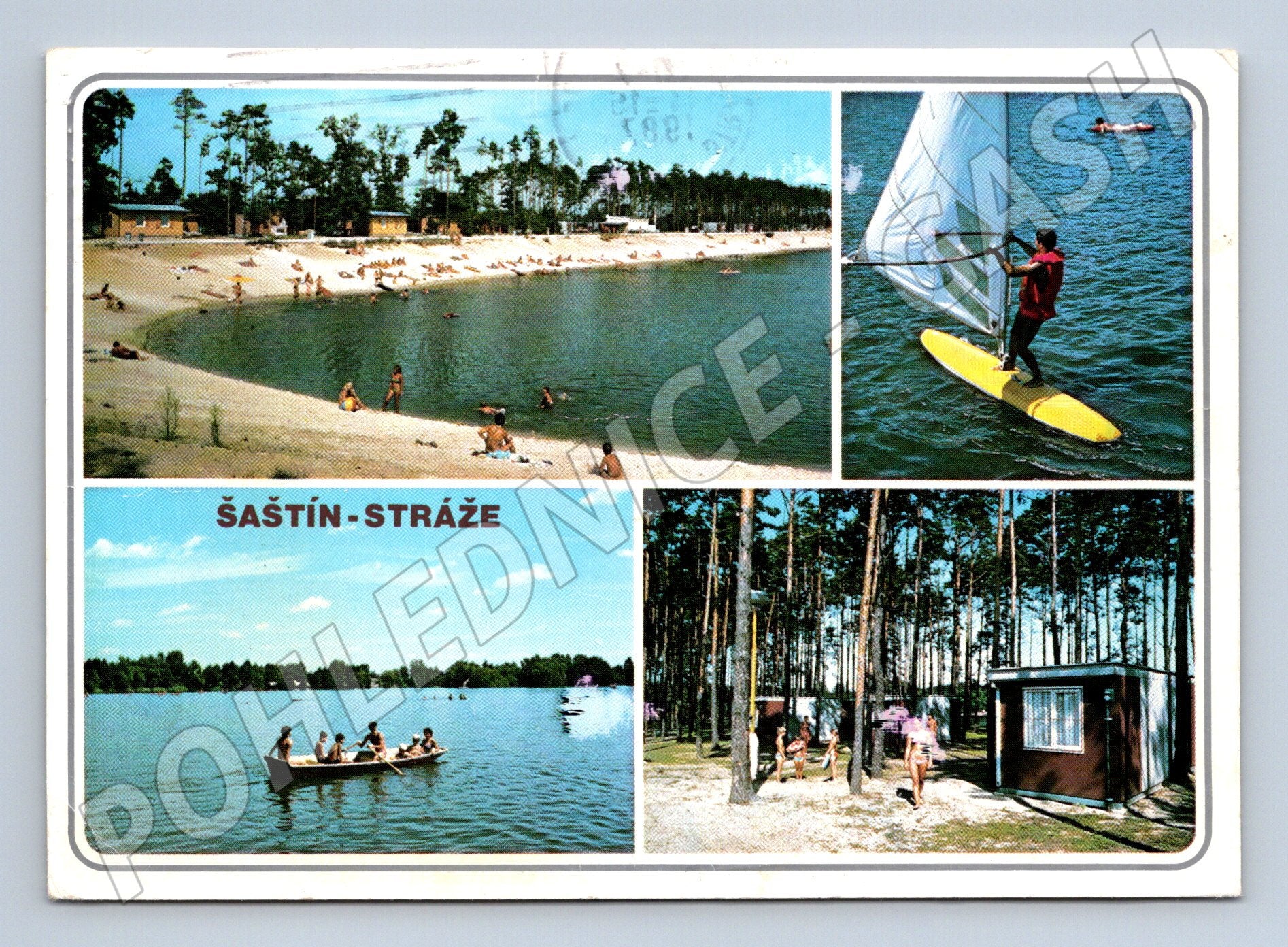 Nabízím originální pohlednici rekreační oblasti Gazarka v Šaštíně-Strážích na Slovensku. Pohlednice zachycuje různé aktivity u vody – koupání, plavbu na lodi, windsurfing a ukázky rekreačního areálu v borovém lese. Na zadní straně je ručně psaný pozdrav z dovolené, originální známka a razítko z období Československa. Technické údaje: foto Ing. I. Ondrejkovič, výtvarný návrh K. Izakovič, tisk Grafobal Skalica. Ideální doplněk pro sběratele pohlednic s tématikou Slovenska nebo dobové rekreace. Stav odpovídá stáří, viz foto.