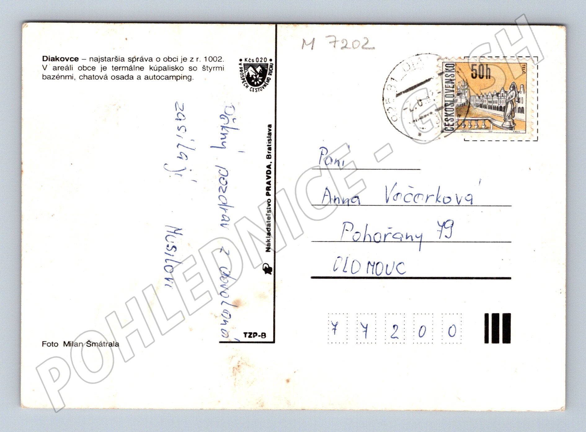 Originální pohlednice z Diakoviec s velmi pěknými barevnými fotografiemi areálu termálního koupaliště, chatek a autokempu. Na přední straně jsou zachyceny letní radovánky lidí v bazénu, odpočinek u stanů i pohled na chatky. Zadní strana pohlednice je použitá, s osobním vzkazem a razítkem, adresovaná do Olomouce. Text v horní části popisuje historii obce Diakovce a vybavení areálu. Autor fotografie: Milan Šmátrala. Vhodná k rozšíření sbírky slovenských historických pohlednic, krásný doklad dobové rekreace na Slovensku.