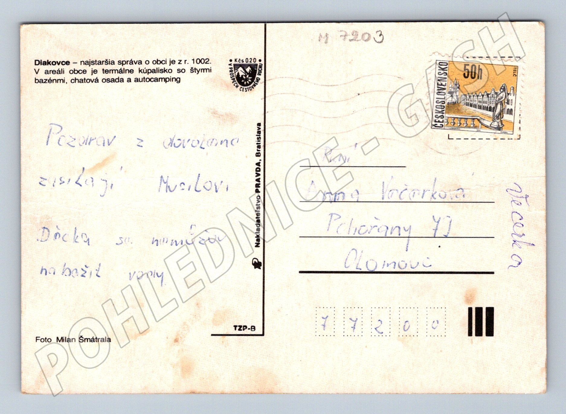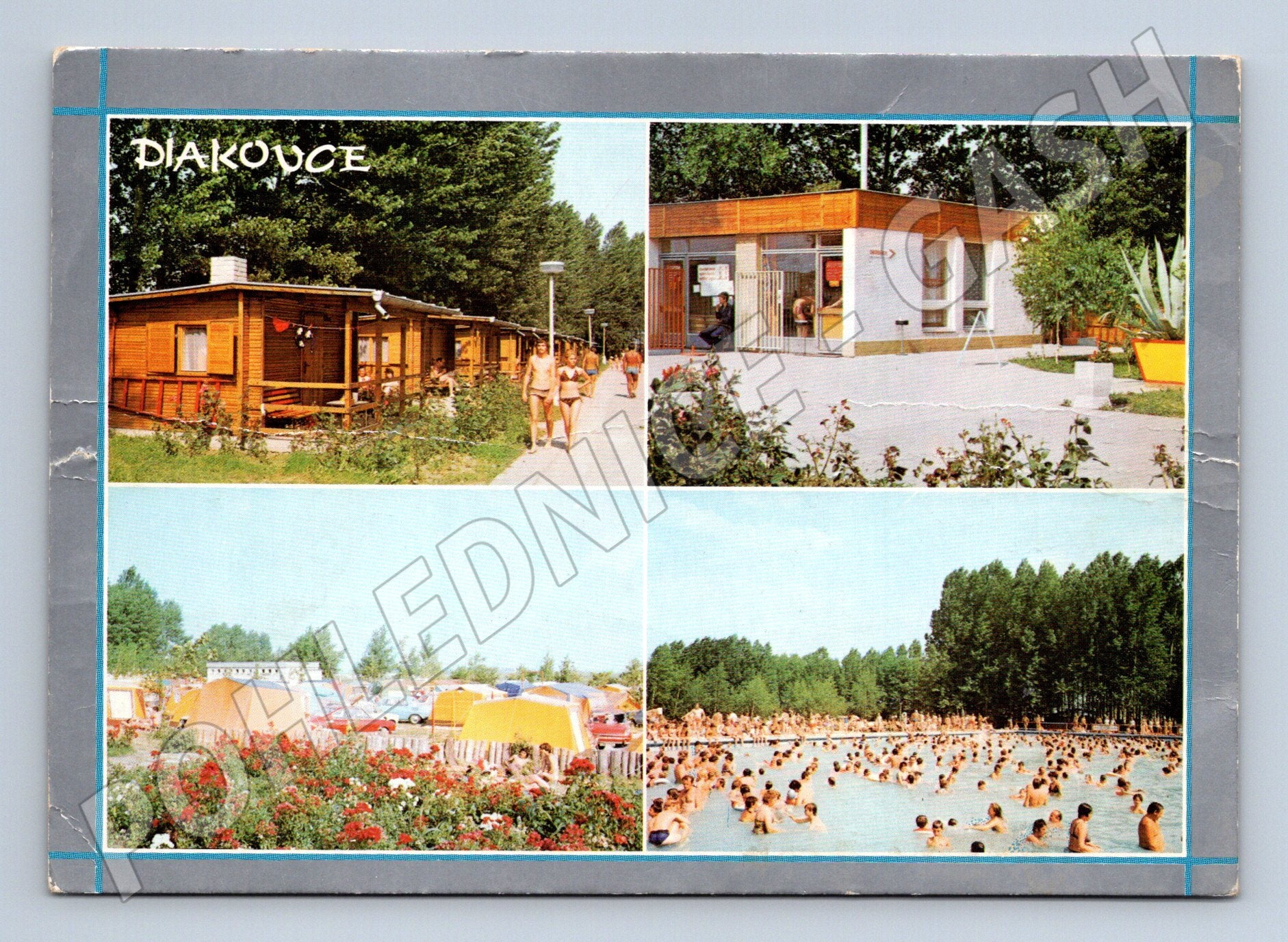 Originální pohlednice z lázeňského areálu v Diakovcích, Slovensko. Pohlednice zachycuje čtyři různé pohledy na rekreační oblast – chatu, vstupní budovu, autokemping s karavany a hlavní termální koupaliště s množstvím návštěvníků v bazénech. Text na zadní straně připomíná typickou dovolenkovou atmosféru. Odesláno z tehdejšího Československa s 50hal. známkou. Pohlednice nese známky stáří, drobné opotřebení na hranách. Fotograf: Milan Šmátrala. Ideální přírůstek do sbírky pohlednic se zaměřením na lázeňství a rekreaci v někdejším Československu.
