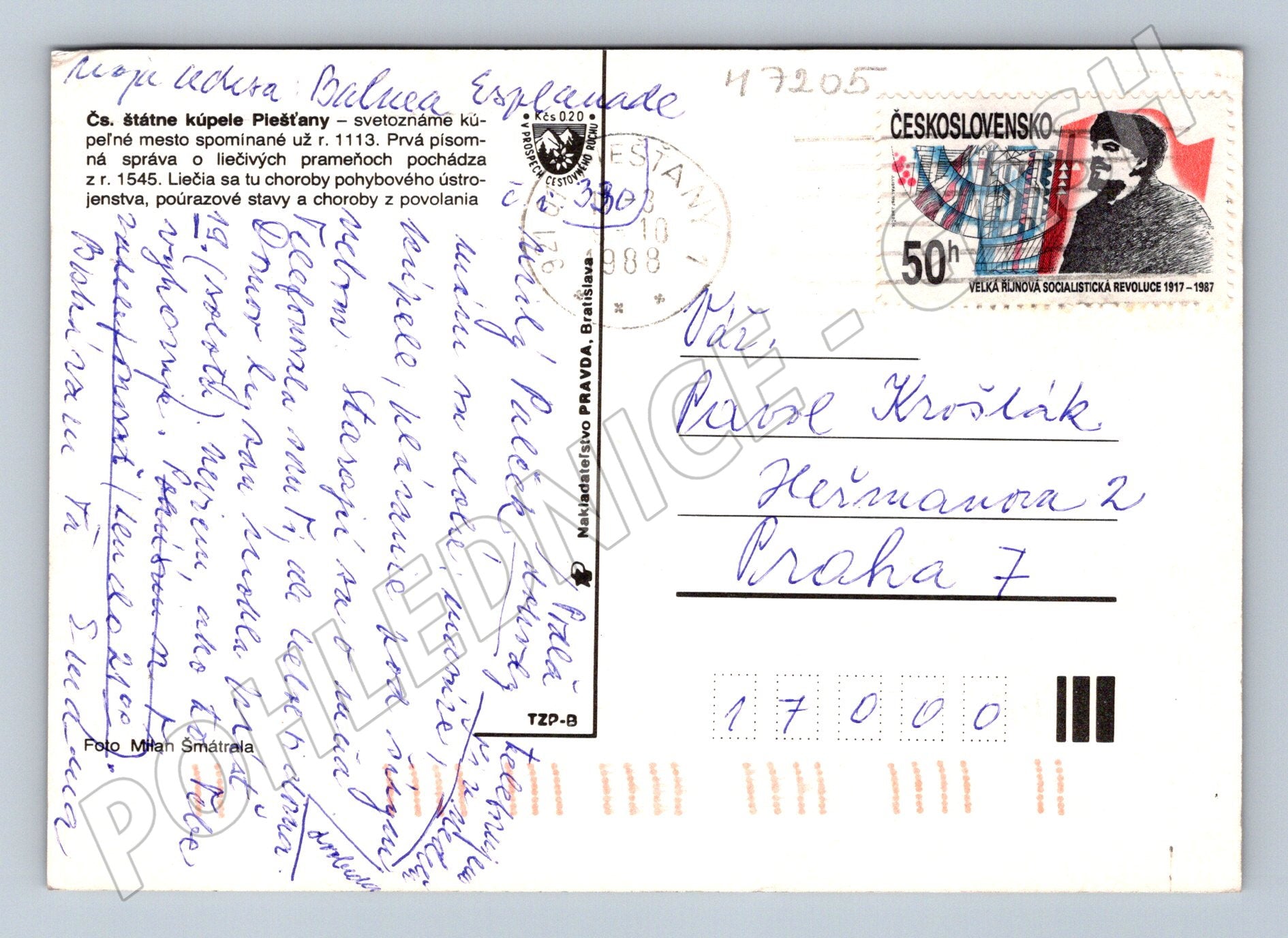 Originální pohlednice z Piešťan, známého slovenského lázeňského města. Na přední straně jsou čtyři barevné fotografie zachycující různé pohledy na město Piešťany v zimě, včetně historických budov a mostu přes řeku Váh. Pohlednice je opatřena slovenským textem, poštovní známkou Československo (s motivem Velké říjnové socialistické revoluce) a razítkem. Na zadní straně je čitelně ručně psaný text, adresa a známka. Jedná se o skvělý sběratelský kus s dobovými prvky, vhodný pro milovníky historie, sběratele pohlednic a zájemce o slovenská lázeňská města. Stav odpovídá stáří, viz foto.