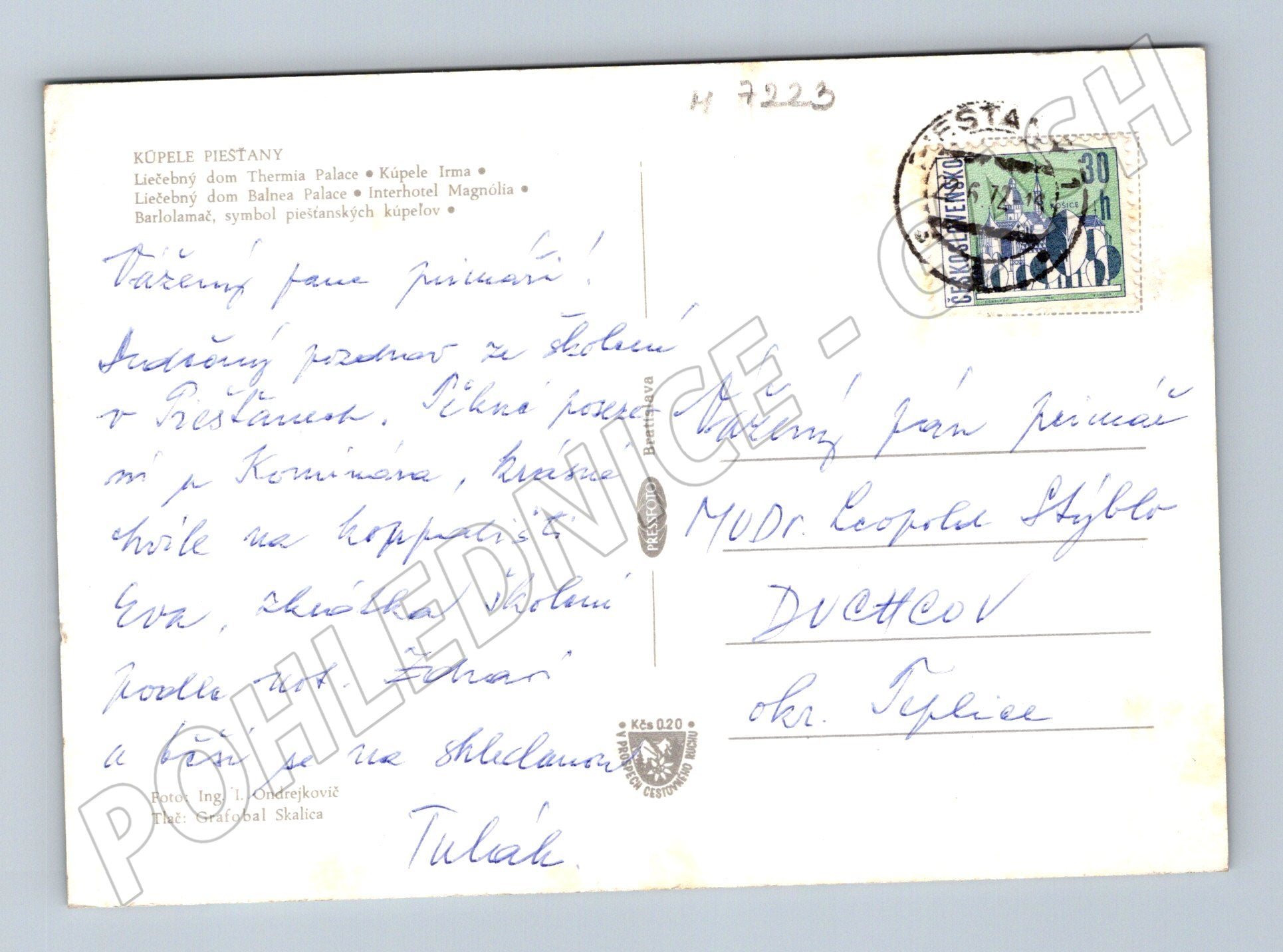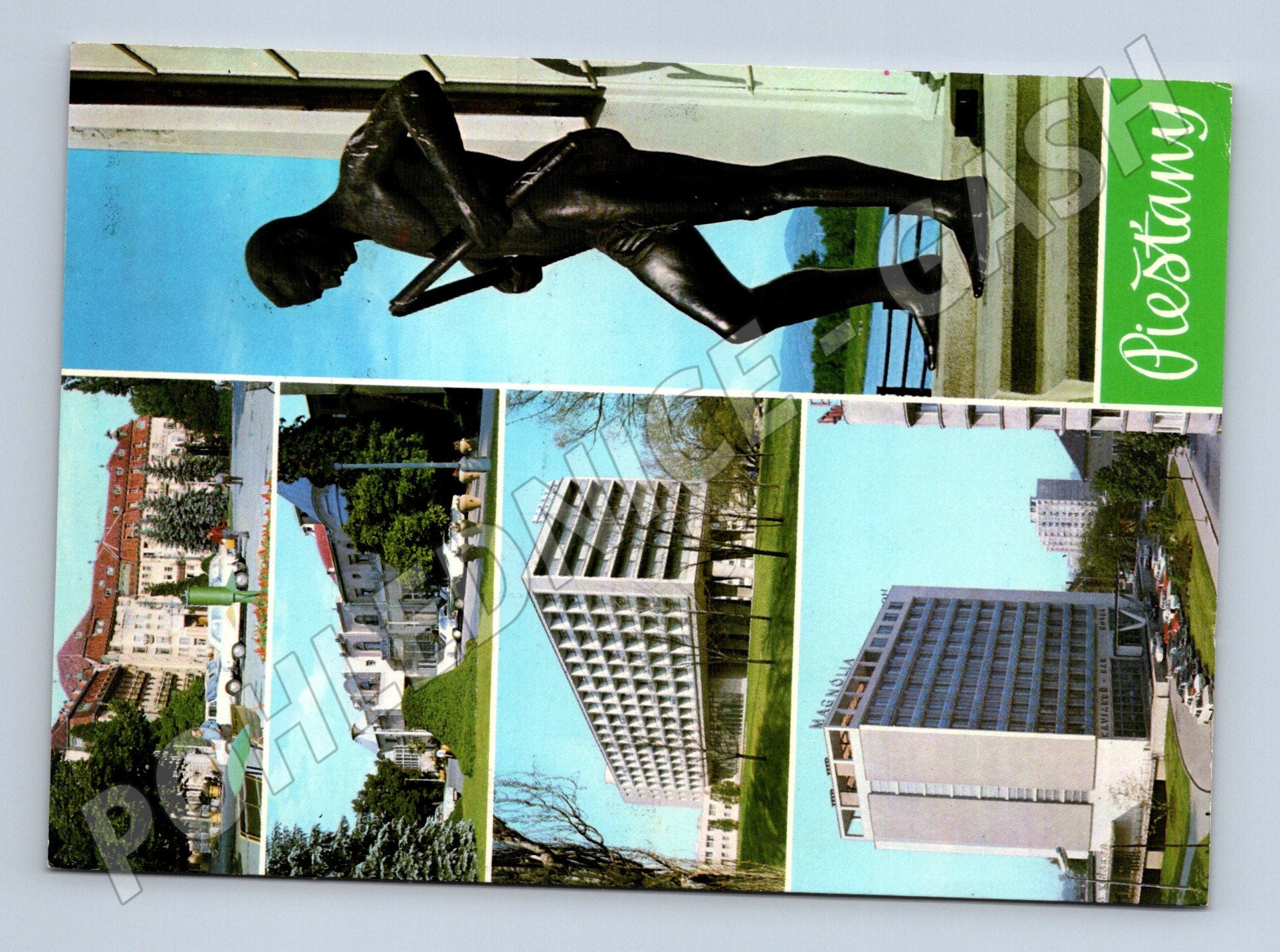 Originální pohlednice z Piešťan zobrazující význačná lázeňská zařízení a moderní architekturu města. Na přední straně jsou koláže s fotografiemi sochy, hotelových a lázeňských budov, včetně typického architektonického stylu slovenského lázeňského města. Zadní strana pohlednice je psaná rukou, orazítkovaná a se známkou. Stav odpovídá stáří, nepatrné opotřebení hran a růžků. Raritní sběratelský kousek ze slovenské historie, vhodný pro sběratele historických pohlednic nebo zájemce o Piešťany a lázeňská města.