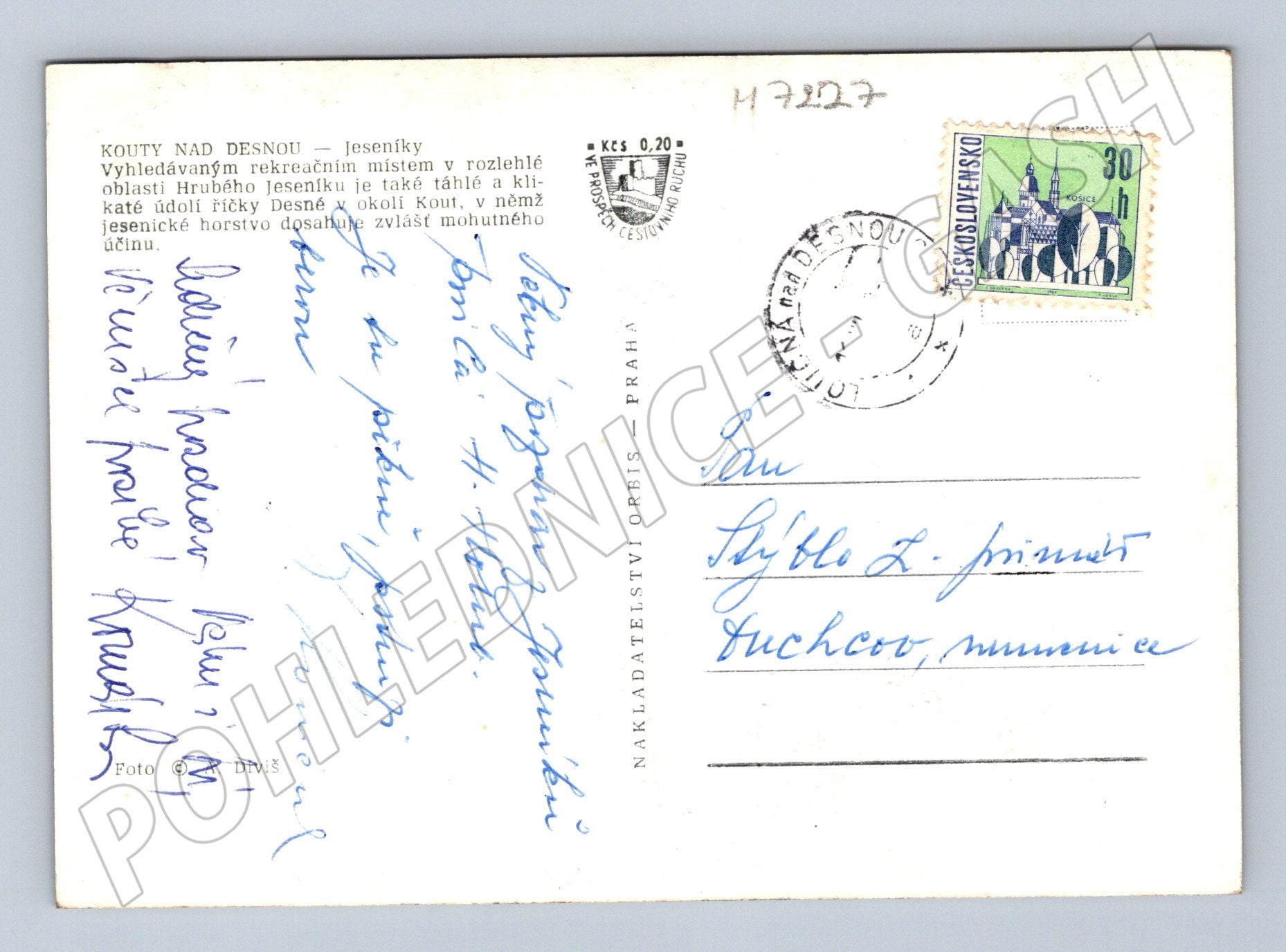 Originální pohlednice s motivem Kouty nad Desnou v Jeseníkách, zachycující malebnou krajinu Hrubého Jeseníku a údolí říčky Desné. Pohlednice je v černobílém provedení a jedná se o starší vydání s razítkem a poštovním použitím (s známkou ČSSR, 30h). Na zadní straně naleznete krátký popis lokality a ručně psaný vzkaz. Stav pohlednice odpovídá stáří, vhodné pro sběratele historických pohlednic regionu Jeseníky a milovníky české krajiny.