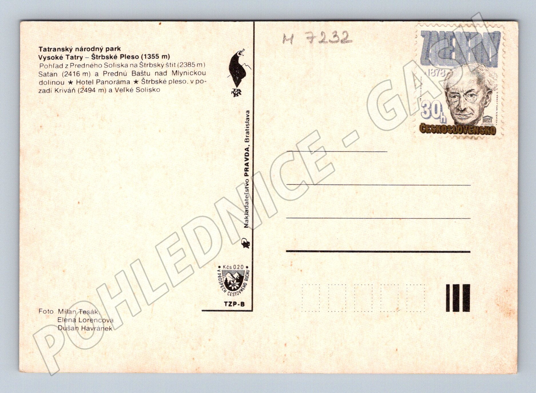 Originální pohlednice s motivem Štrbského Plesa ve Vysokých Tatrách. Pohlednice zachycuje krásnou scenérii slovenských hor, známé turistické a rekreační oblasti. Na přední straně jsou poutavé fotografie jezera, okolních hor a známého hotelu Panoráma. Na zadní straně je podrobný popis výhledu, včetně zmínky o Tatranském národním parku a hlavních vrcholech (Štrbský štít, Kriváň, Predné Solisko, Satan aj.). Pohlednice je opatřena čs. poštovní známkou a drobným zápisem tužkou. Vhodná do sbírky sběratelů slovenských pohlednic nebo jako dárek milovníkům Tater. Fotografovali Milan Tesák, Elena Lorencová, Dušan Havránek. Rozměr klasického malého formátu, mírné opotřebení odpovídající stáří.