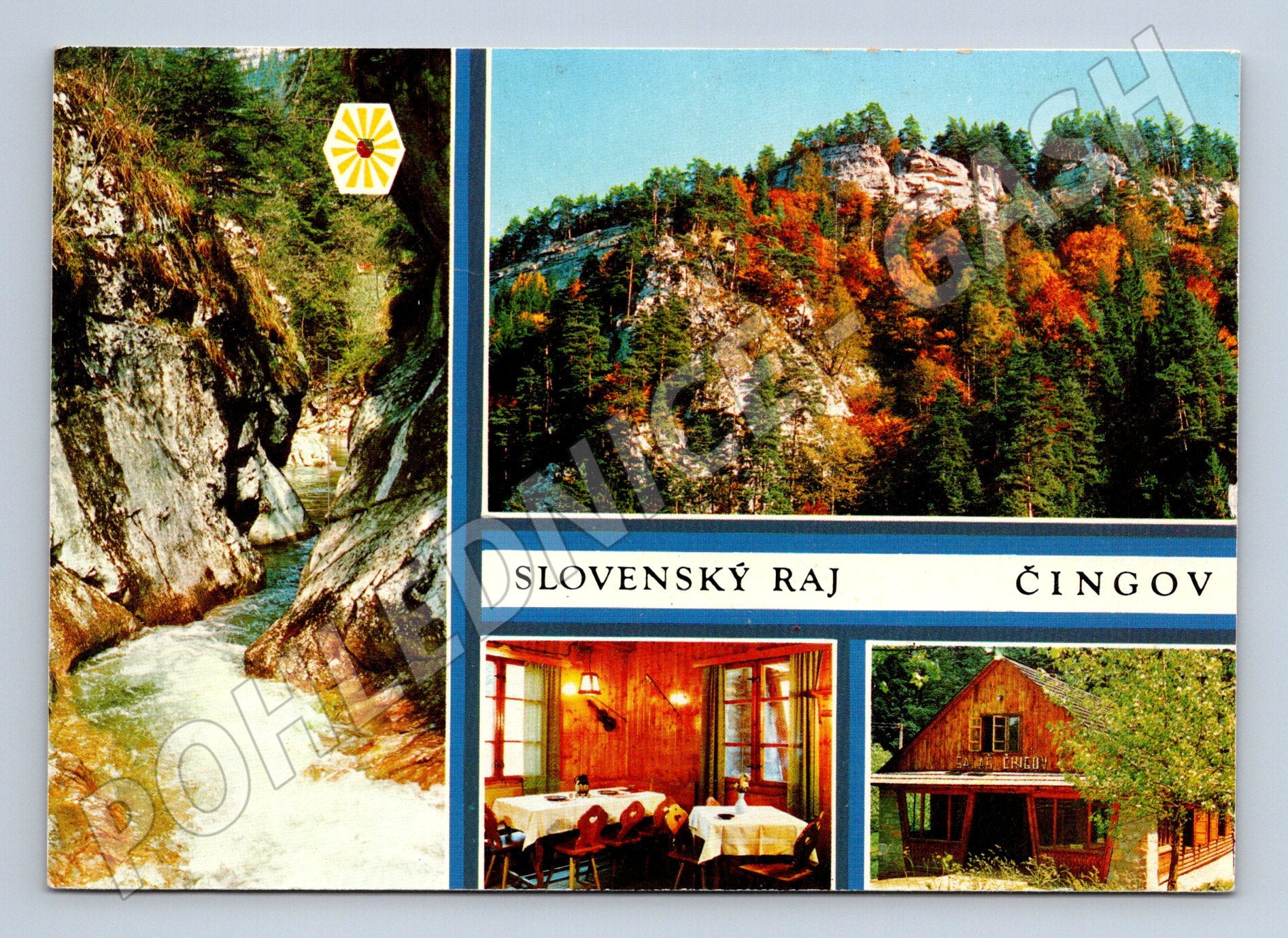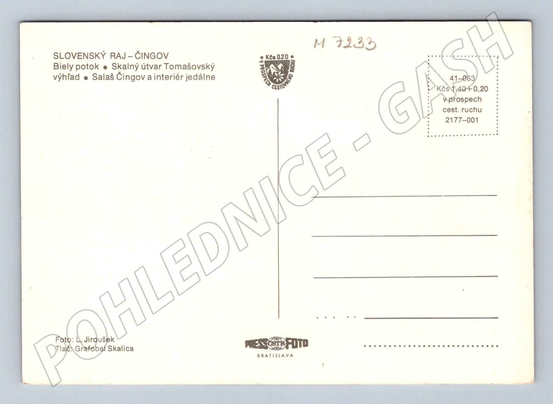 Originální pohlednice ze Slovenského ráje, konkrétně z oblasti Čingov. Pohlednice zachycuje malebné scenérie této známé slovenské přírodní rezervace: říčku Biely potok v kaňonu, impozantní skalní útvar Tomašovský výhled, salaš Čingov a interiér horské chaty. Na zadní straně je vytištěn popis lokalit, autor fotografie L. Jiroušek a vydavatel Grafobal Skalica. Pohlednice je určena sběratelům i milovníkům slovenské přírody. Velmi pěkný stav, formát odpovídá období před rokem 1950.