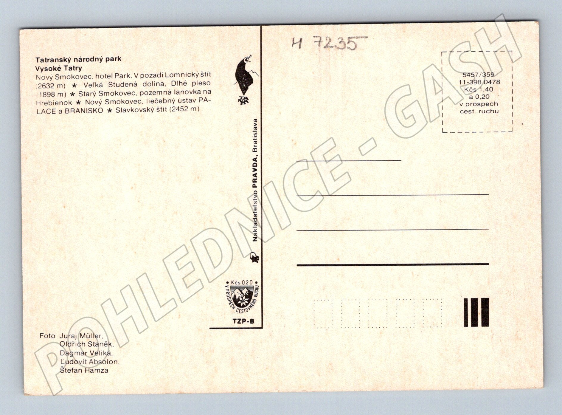 Originální pohlednice Pozdrav zo Smokovca z Vysokých Tater, konkrétně z oblasti Nového Smokovce. Na přední straně je koláž fotografií s typickými scenériemi Tatranského národního parku – hotel Park, Lomnický štít, Velká Studená dolina, Dlhé pleso a další zajímavosti včetně pozemní lanovky na Hrebienok. Pohlednice nese všechny znaky dobové produkce vydavatelství Pravda Bratislava a jsou zde uvedena jména autorů fotografií (Juraj Müller, Oldřich Staněk, Dagmar Veliká, Ludovit Absolon, Štefan Hamza). Vhodné pro sběratele tatranských či slovenských pohlednic. Stav viz scan, neprošlé poštou.