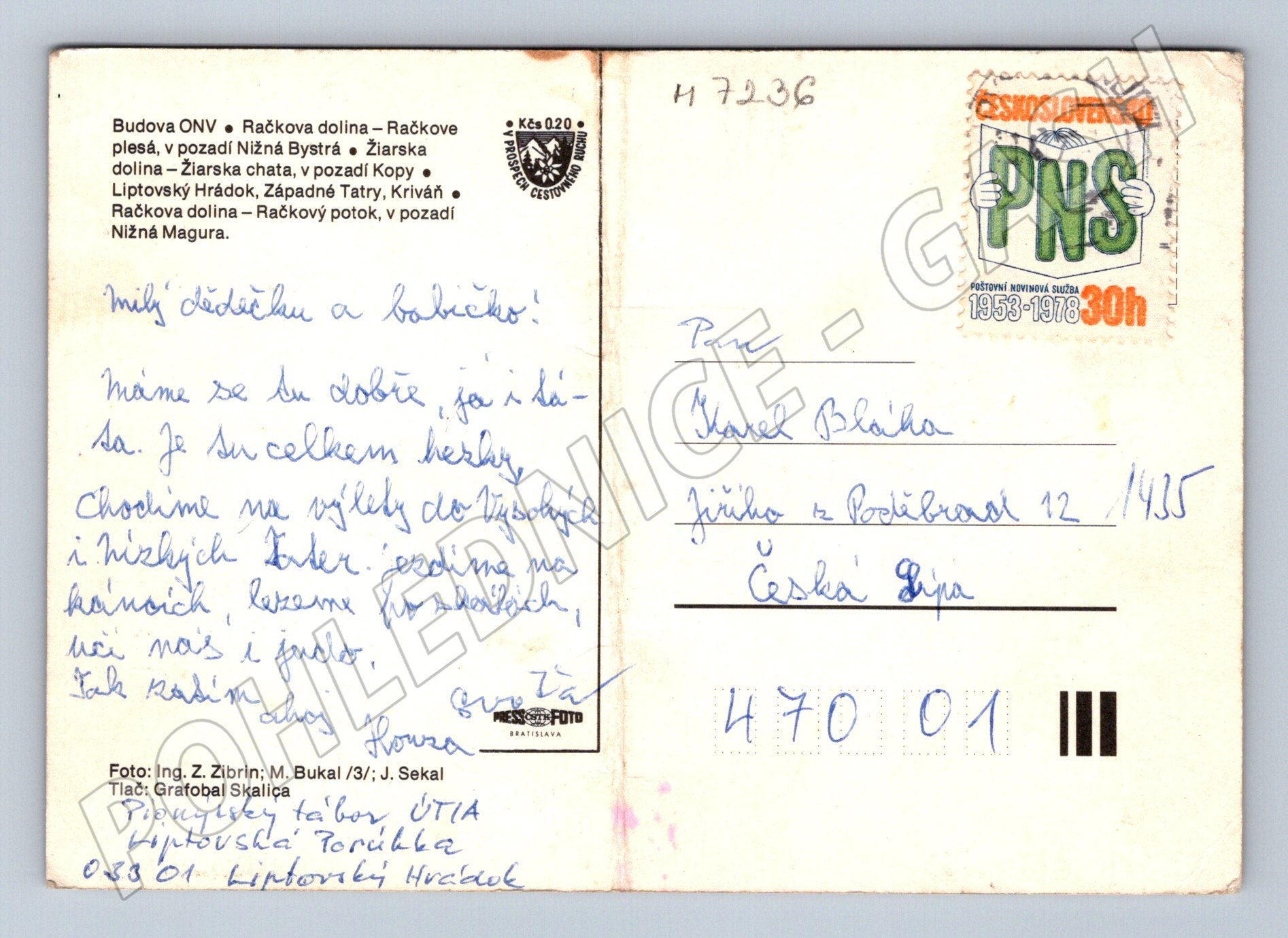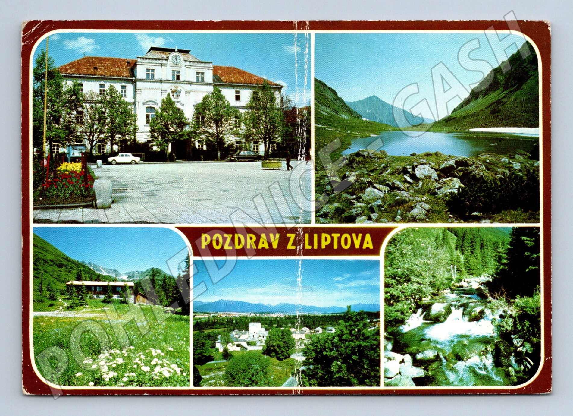 Originální barevná pohlednice s názvem Pozdrav z Liptova . Pohlednice zobrazuje několik typických scenérií a pamětihodností z regionu Liptov na Slovensku, například Račkovu dolinu, Račkove pleso, západní Tatry a další přírodní krásy. Na zadní straně je ručně psaný pozdrav z letního tábora a slovenská poštovní známka PNS (Poštovní novinová služba) z období Československa. Jedná se o sběratelsky zajímavý kousek s dobovými reáliemi, vhodný pro milovníky slovenské historie, tatranské přírody a starých pohlednic. Stav viz foto, rohy mírně opotřebované, pravá sběratelská atmosféra.