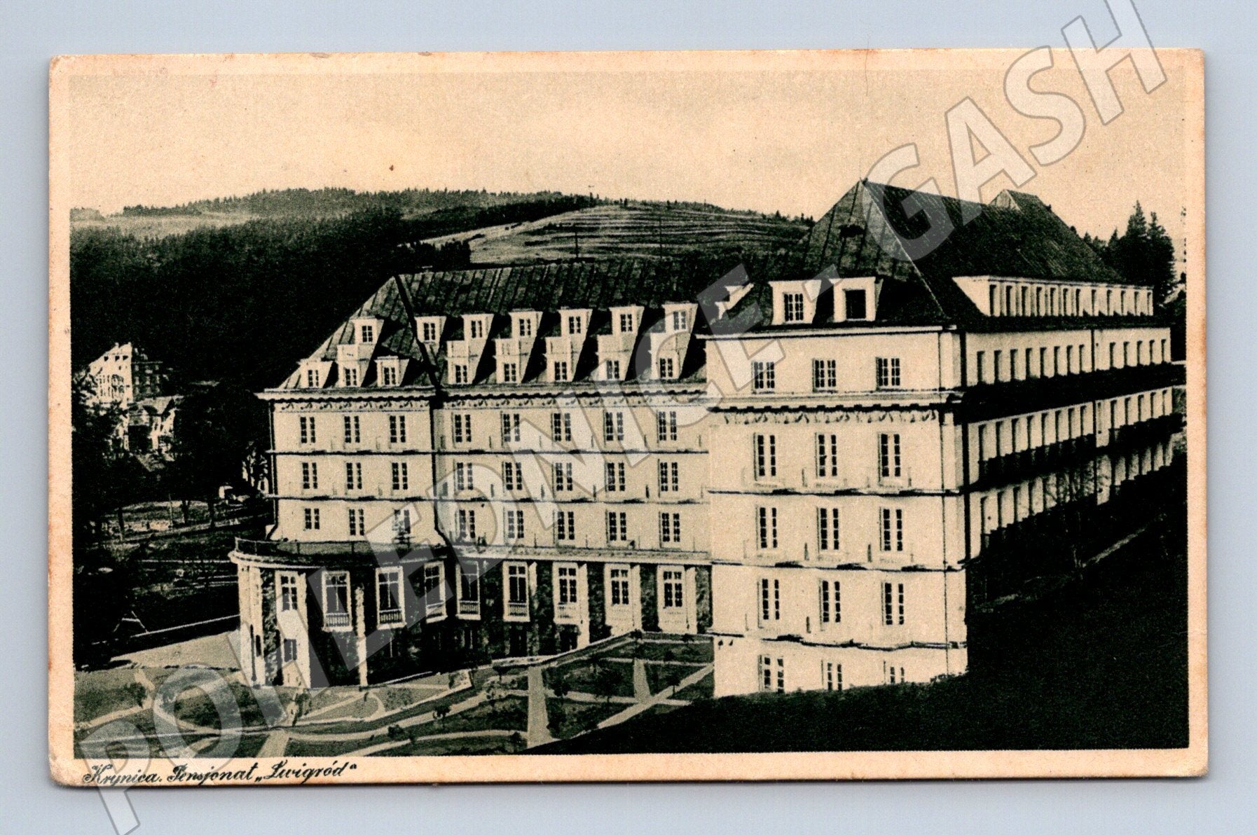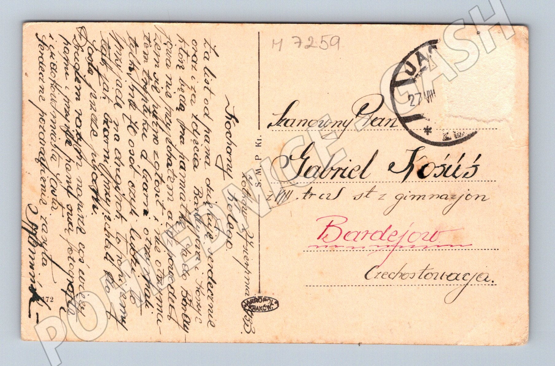 Originální stará pohlednice lázeňského domu Kurpienica - Pensjonat, Swigród. Pohlednice pochází z období první poloviny 20. století. Na přední straně je černobílý snímek rozlehlé budovy v přírodním prostředí, na zadní straně je ručně psaný text a razítko z 27.8. určené pro adresáta v Bardejově, Československo. Pohlednice je v zachovalém stavu, vhodná pro sběratele historických pohlednic, zájemce o lázeňské objekty či dějiny regionu. Rozměry pohlednice odpovídají běžnému malému formátu. U této pohlednice se jedná o zajímavý sběratelský kus s adresací na Gymnázium v Bardejově.