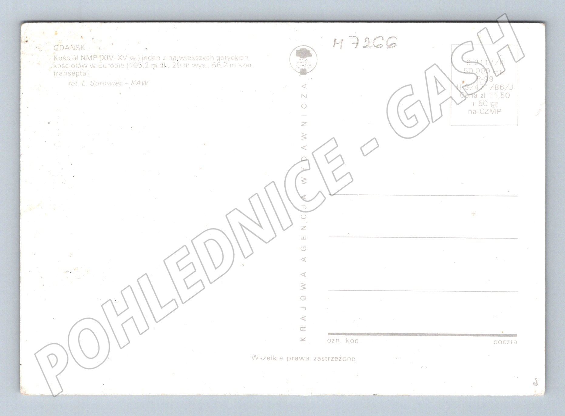 Pohlednice s barevným pohledem na kostel Nanebevzetí Panny Marie (kościół NMP) v Gdaňsku, Polsko. Jedná se o jeden z největších cihlových gotických kostelů v Evropě, vystavěný ve 14.–15. století. Rozměry kostela jsou 105,2 m na délku, 29 m výška, 66,2 m šířka transeptu. Pohlednice je ve velmi dobrém stavu, na zadní straně je krátký popis v polštině a vydavatelské údaje. Vhodné pro sběratele polské architektury nebo historických památek. Originál fotografie: L. Surowiec, vydala KAW.