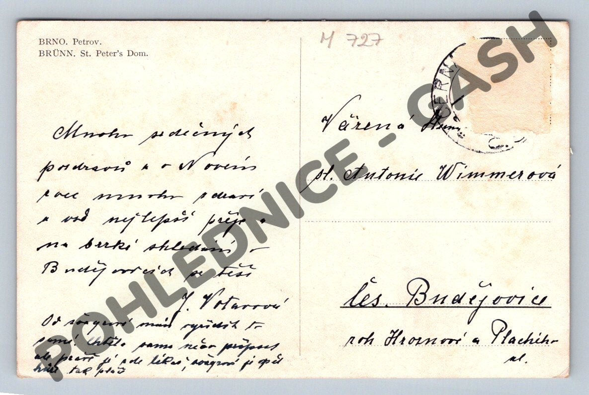 Nabízím starou historickou pohlednici zobrazenou v černobílém provedení, zachycující katedrálu sv. Petra a Pavla v Brně, známou jako Petrov. Pohlednice je opatřena dobovým textem a známkou s poštovním razítkem, původně adresovaná do Českých Budějovic. Vynikající kousek pro sběratele historických pohlednic a milovníky české architektury. Velikost malého formátu typická pro pohlednice do roku 1950, stav odpovídá stáří s jemnými známkami opotřebování, které však přidávají na autentičnosti a historické hodnotě.