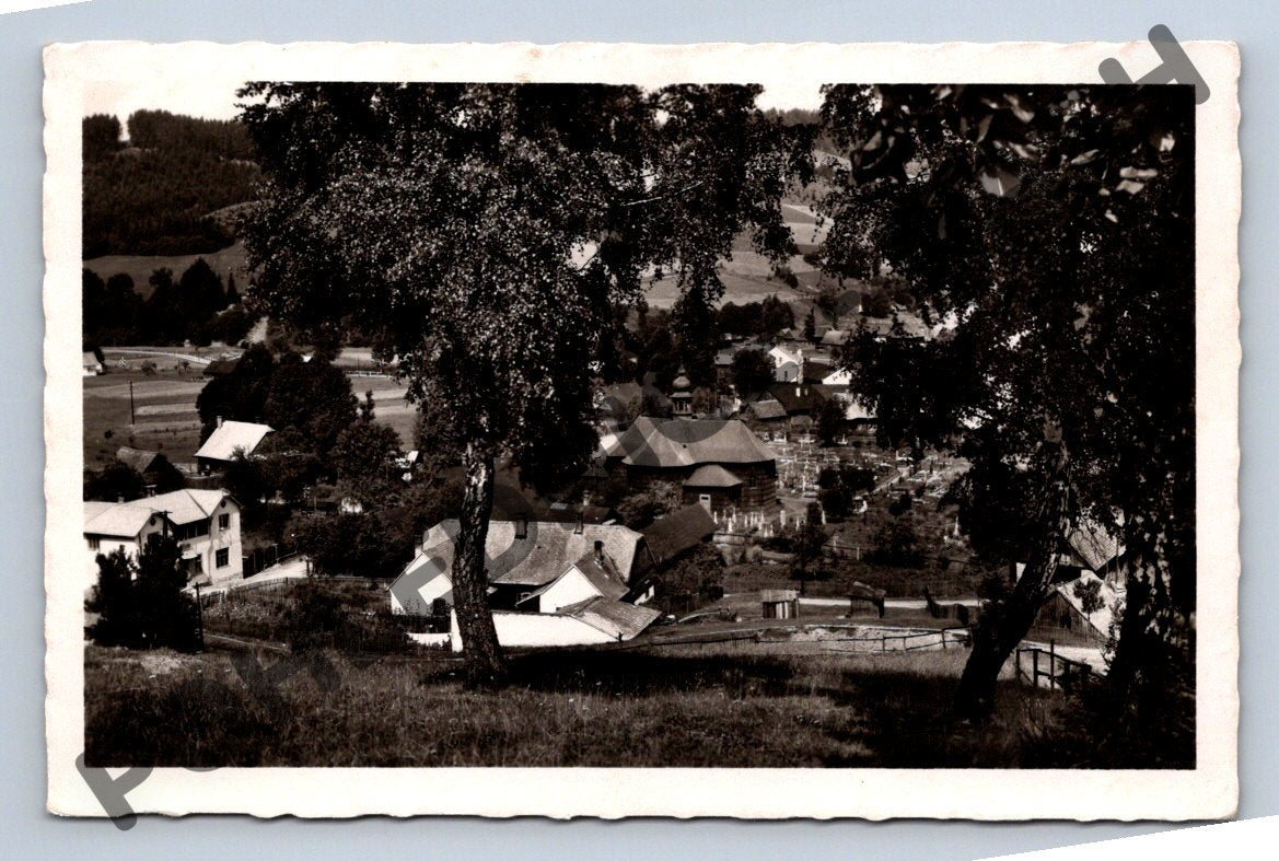 Tato stará černobílá pohlednice zobrazuje malebnou scénu z Velkých Karlovic, konkrétně z části Gross Karlowitz. Pohlednice ukazuje tradiční architekturu horské vesnice a okolní přírodu, zachycenou z vyvýšeného místa mezi stromy. Na zadní straně se nachází psaný text, razítko a známka Československo, což svědčí o jejím stáří a autenticitě, pravděpodobně z první poloviny 20. století. Pohlednice je vhodná pro sběratele historických pohlednic z českého regionu Beskydy a Milovníky starých fotografií horských vesnic.