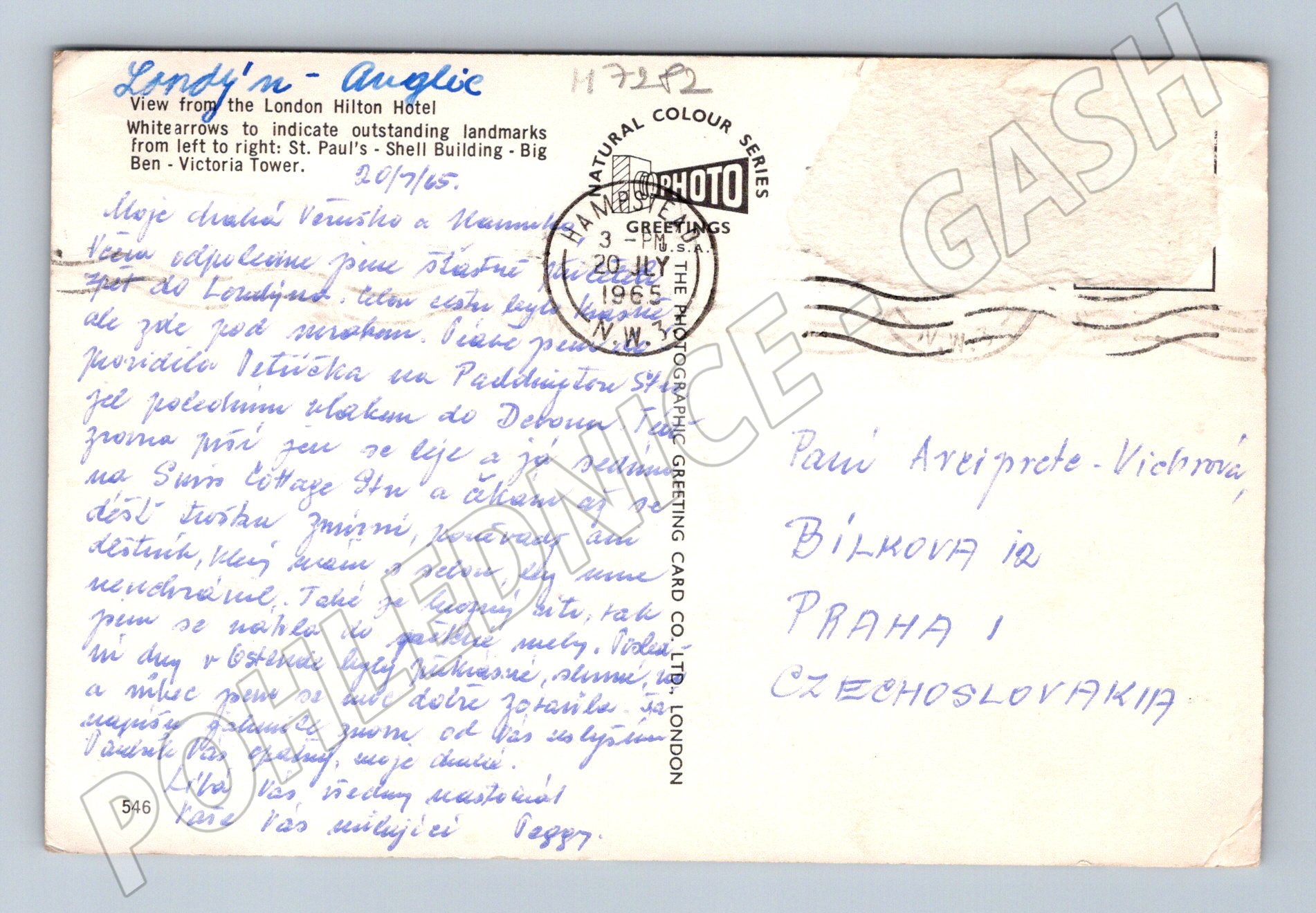 Originální pohlednice s panoramatem Londýna, focená z London Hilton Hotelu, vydaná okolo roku 1965. Na pohlednici jsou bílé šipky označující významné londýnské památky: St. Paul s, Shell Building, Big Ben a Victoria Tower. Zadní strana je popsaná, s poštovním razítkem z roku 1965 a zaslaná do tehdejšího Československa. Dobový pohled do města i cenný sběratelský kousek s autentickým pozdravem a známkami stáří. Pohlednice je v zachovalém stavu, avšak s patrnými stopami opotřebení na okrajích a rozích. Vhodná pro sběratele i milovníky historie Londýna či britských pohlednic.