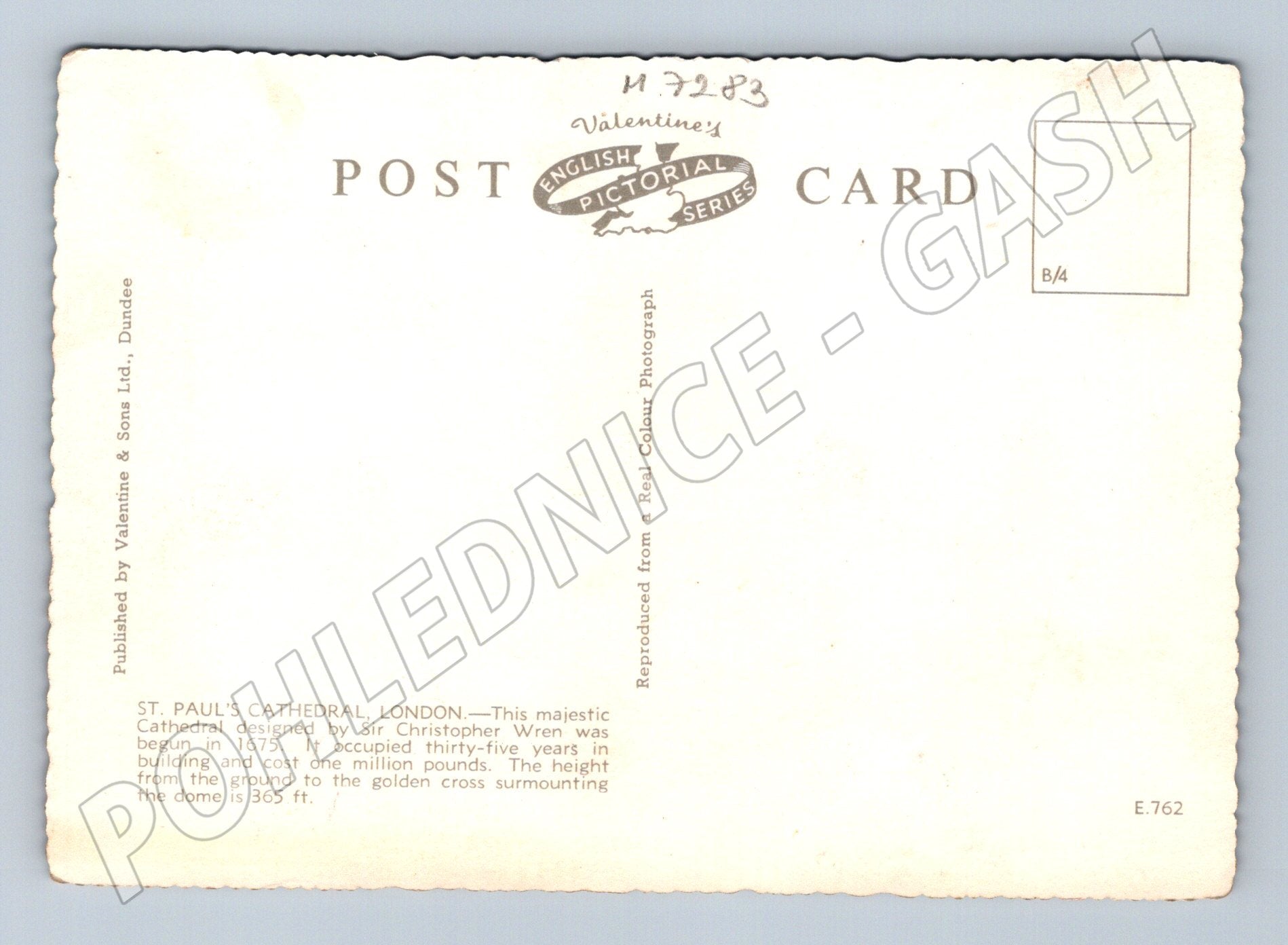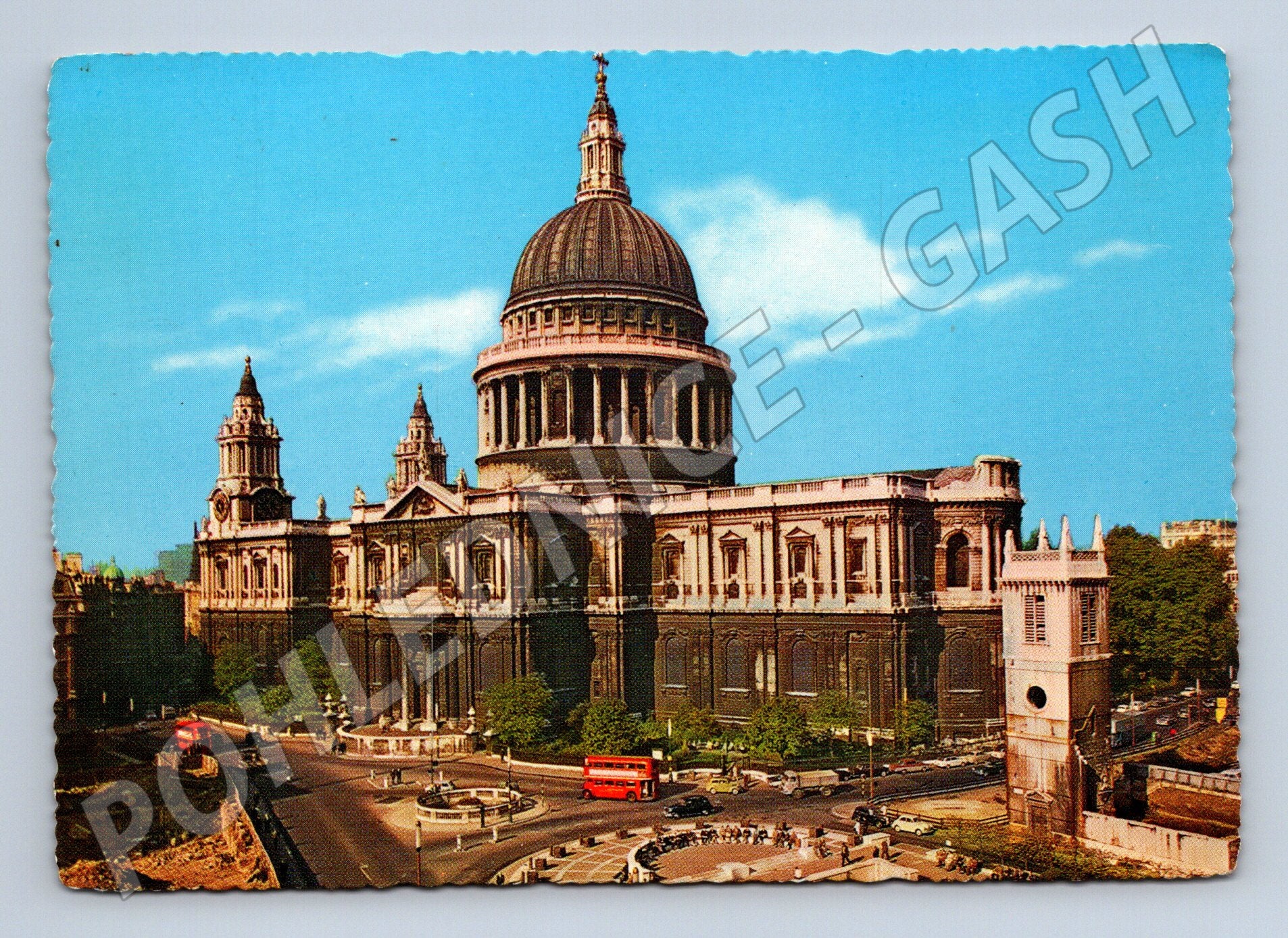 Originální barevná pohlednice s motivem ikonické katedrály sv. Pavla v Londýně, Velká Británie. Pohlednice zachycuje majestátní stavbu navrženou sirem Christopherem Wrenem, jejíž výstavba byla zahájena v roce 1675 a trvala celkem 35 let. Katedrála je známá svou výraznou kopulí, která se tyčí do výšky 365 stop. Na přední straně jsou také viditelné tradiční červené londýnské autobusy, které dotváří autentickou atmosféru města. Na zadní straně najdete krátký popis tohoto významného historického objektu v angličtině. Pohlednice má typický britský vzhled, zoubkované okraje, je ve velmi dobrém stavu, neprošlá poštou. Ideální pro sběratele pohlednic s tématikou Velké Británie, architektury či londýnských památek.