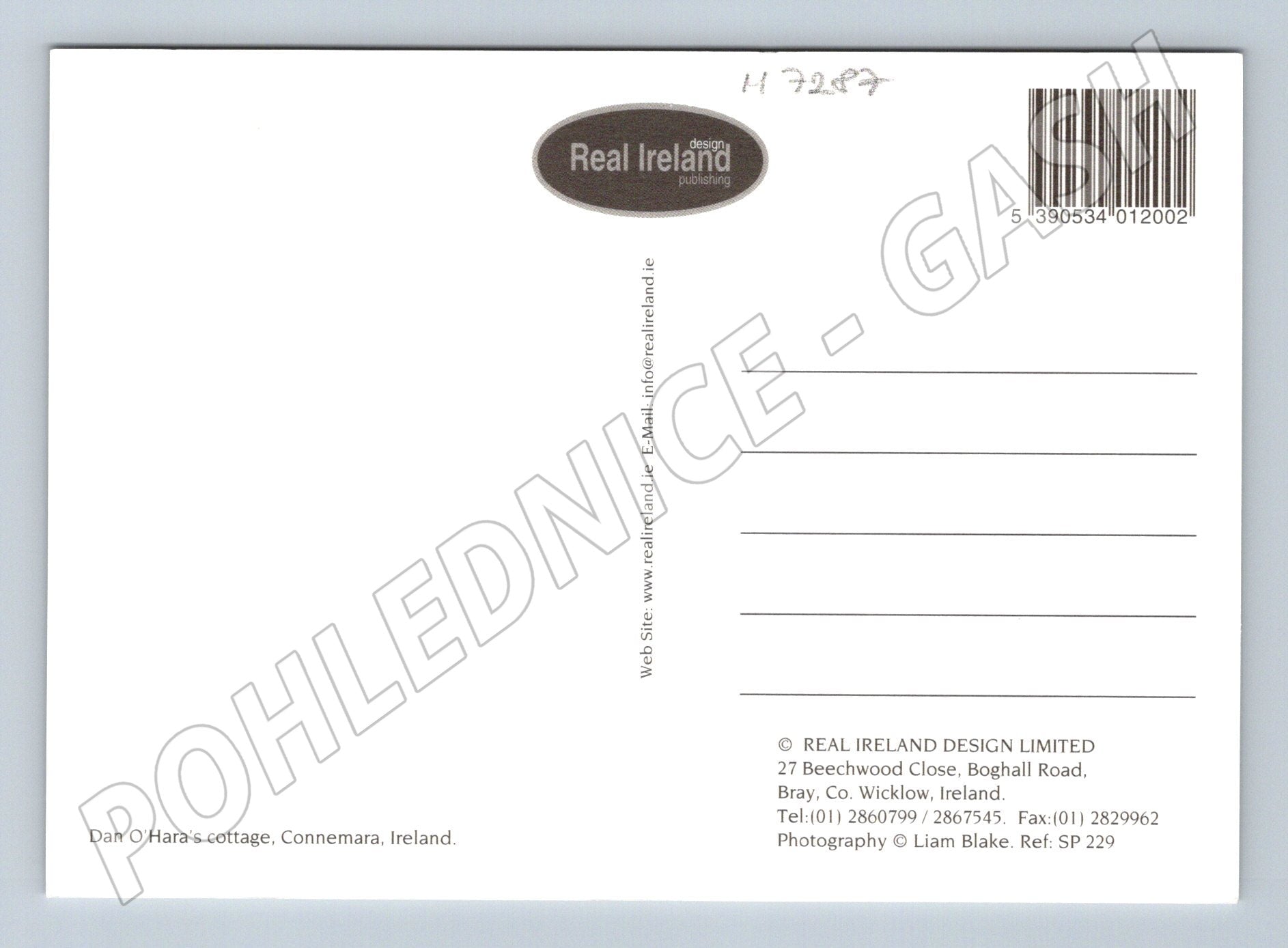 Nabízím originální pohlednici z Irska s motivem tradiční kamenné chalupy s doškovou střechou v oblasti Connemara. Na přední straně je barevná fotografie Dan O’Hara’s cottage, před domem se nachází domácí drůbež a muž ve dveřích. Typická irská venkovská scenérie zachycuje atmosféru minulých dob. Zadní strana je nepopsaná, s možností odeslání, uveden název Dan O Hara s cottage, Connemara, Ireland. Vydavatel: Real Ireland Design Limited. Krásná pohlednice vhodná pro sběratele i milovníky Irska.