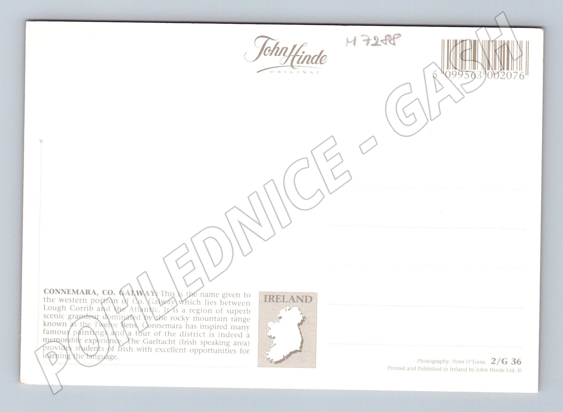 Originální pohlednice z oblasti Connemara v hrabství Galway, Irsko. Na přední straně je barevná fotografie tradičních kamenných domků se slaměnými střechami a volně pobíhajícími slepicemi, s nádhernou horskou krajinou v pozadí. Zadní strana obsahuje popis v angličtině o této malebné oblasti, která je známá svou přírodní krásou, malířskou inspirací a je důležitou částí irsky mluvícího regionu. Pohlednice je neprošlá poštou, ve velmi dobrém stavu. Vhodné pro sběratele i milovníky Irska.