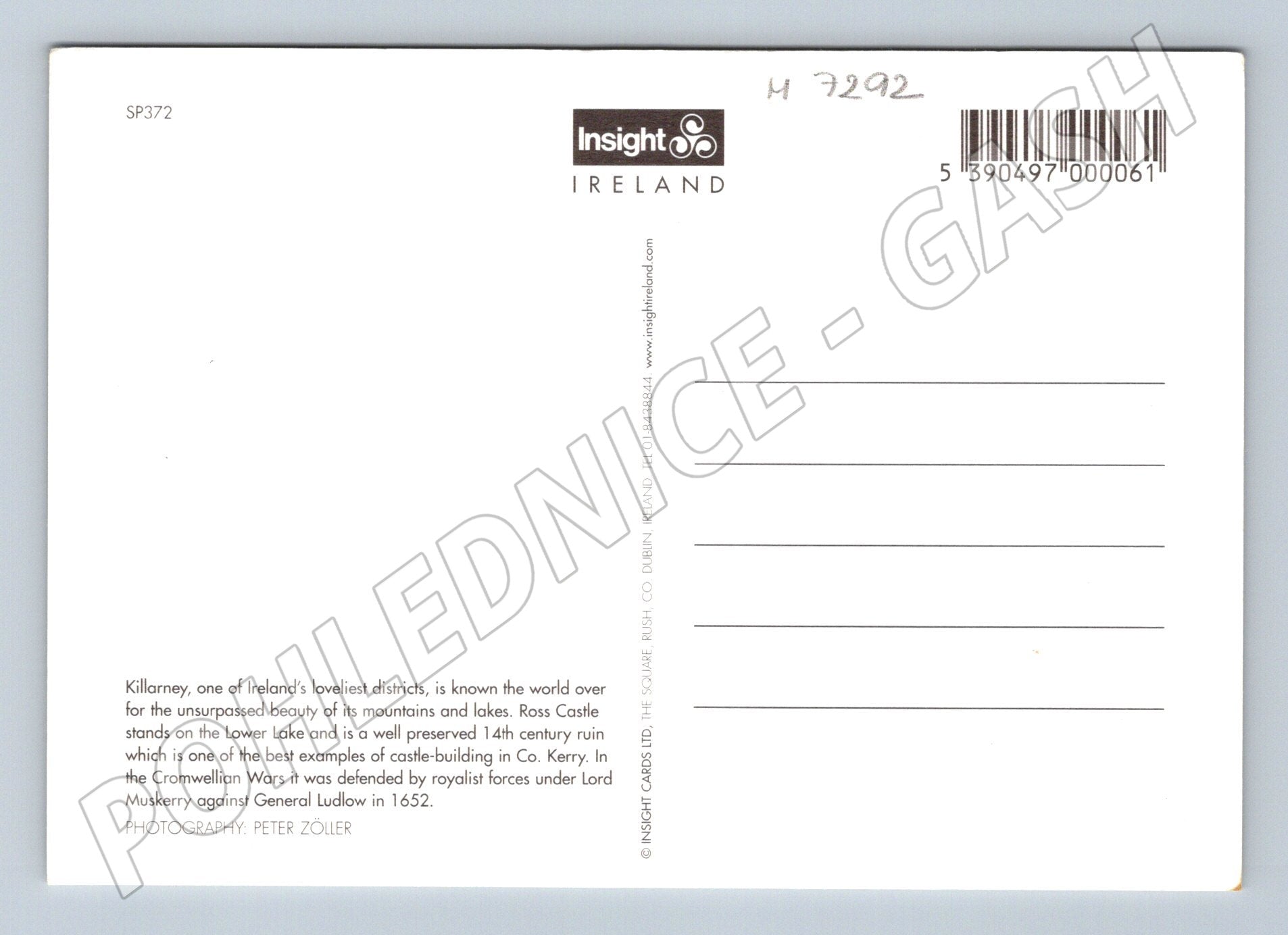 Barevná pohlednice z Irska zobrazující Ross Castle, krásně zachovalou středověkou hradní stavbu na břehu Lower Lake v Killarney. Na přední straně je působivý pohled na hrad s jeho odrazem na klidné hladině jezera, v popředí rámovaný stromy. Na zadní straně najdeme informace o lokalitě – Ross Castle pochází ze 14. století a je považován za jeden z nejlepších příkladů hradní architektury v oblasti Co. Kerry. Ve válkách Cromwellových byl roku 1652 bráněn royalistickými silami pod vedením lorda Muskerryho. Pohlednice je neprošlá poštou, ve velmi dobrém stavu. Fotograf: Peter Zöller. Ideální pro sběratele hradních pohlednic nebo milovníky Irska.