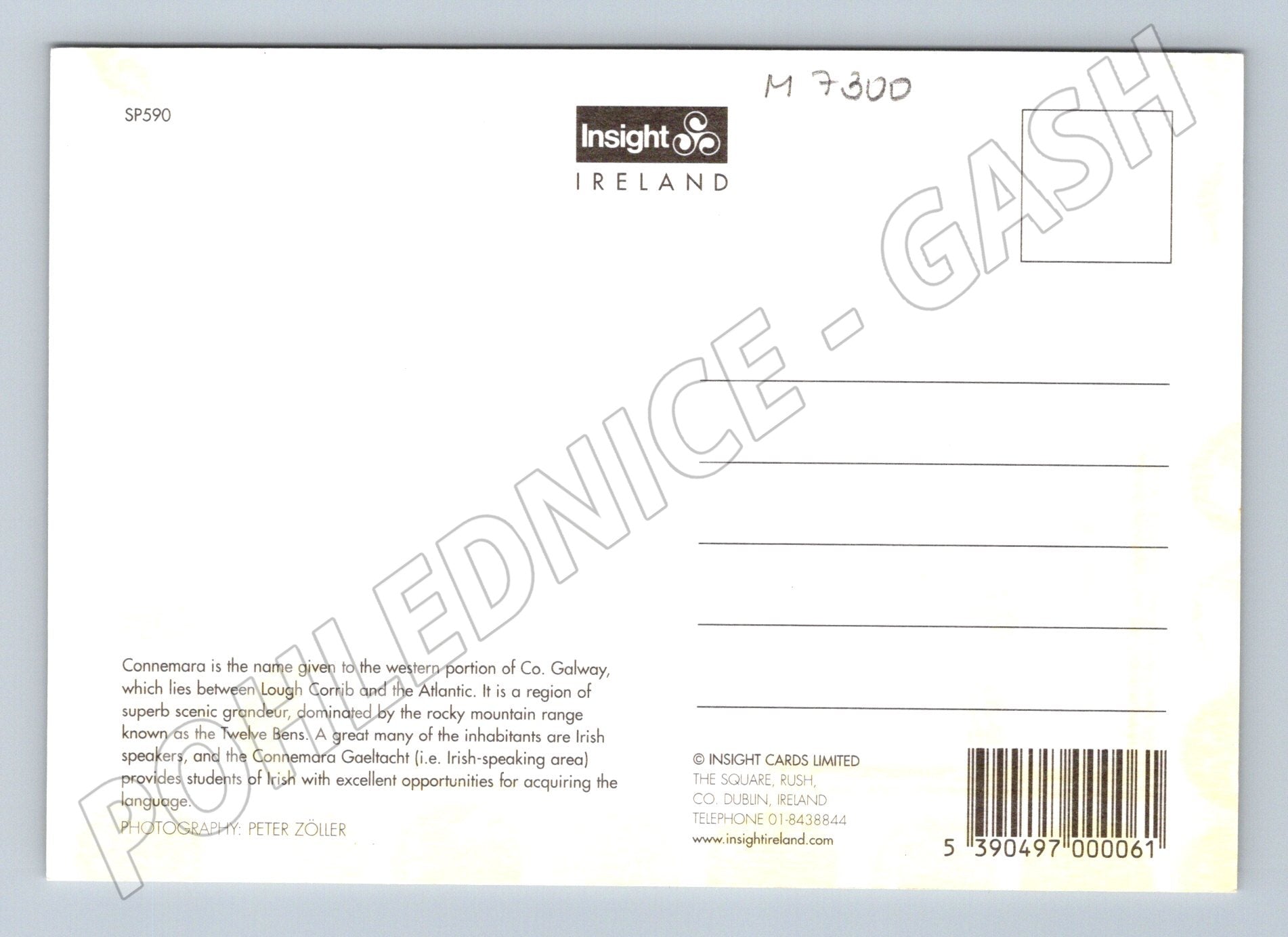 Originální barevná pohlednice s motivem malebné přírody oblasti Connemara na západě Irska, konkrétně Kylemore Lough. Pohlednice zachycuje typickou irskou krajinu s jezerem, horami a charakteristickými stromy v květu. Na zadní straně je krátký popis oblasti Connemara, známé svými scenériemi, horami zvanými Twelve Bens a výraznou irskou kulturou. Vhodná pro sběratele pohlednic se zaměřením na přírodu a zahraničí.