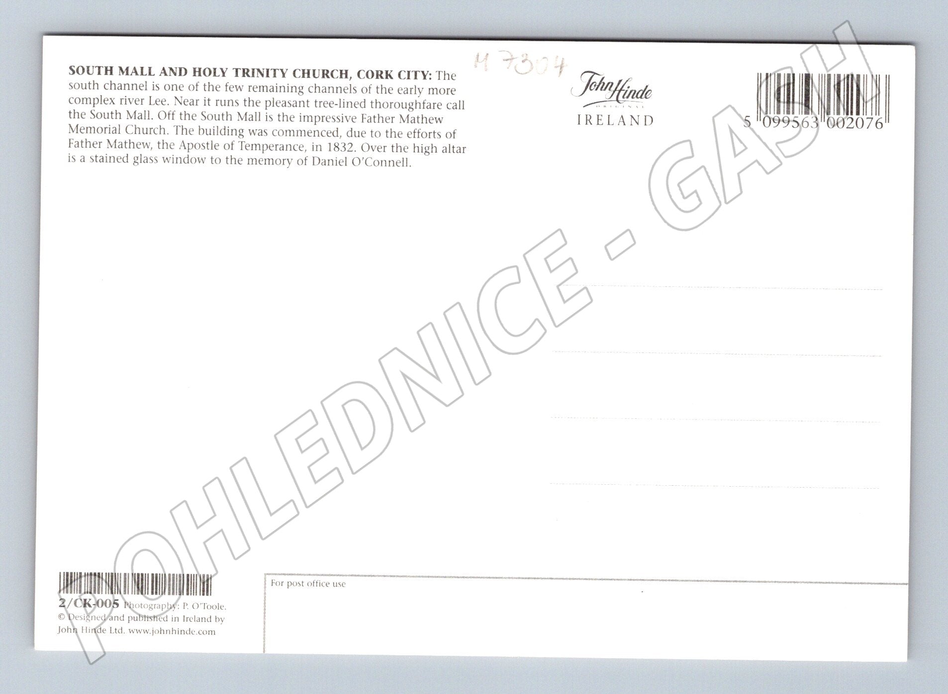 Originální barevná pohlednice z irského města Cork zobrazující známou oblast South Mall s památníkem a řekou Lee. Na snímku je také vidět Holy Trinity Church a typická městská atmosféra s historickými budovami a automobilovým provozem. Zadní strana pohlednice obsahuje popis v angličtině: South Mall and Holy Trinity Church, Cork City. South channel is one of the few remaining channels of the early more complex river Lee. Near it runs the pleasant tree-lined thoroughfare called South Mall. Off the South Mall is the impressive Father Mathew Memorial Church. The building was commenced, due to the efforts of Father Mathew, the Apostle of Temperance, in 1832. Over the high altar is a stained glass window to the memory of Daniel O Connell. Pohlednice nikdy nebyla použita, ve skvělém sběratelském stavu. Vydavatel: John Hinde, Irsko, číslo 2/CK-005.