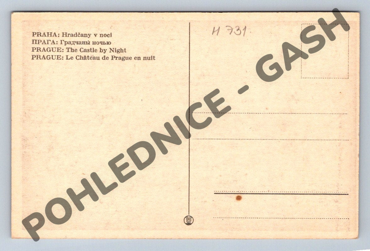 Tato stará pohlednice zachycuje pražský Hrad s Karlovým mostem v noci. Noční fotografie zdůrazňuje tiché, tajemné osvětlení historických staveb a jejich odraz ve vodě Vltavy. Pohlednice je tištěna v několika jazycích, včetně češtiny, ruštiny, angličtiny a francouzštiny, což naznačuje její evropský původ a univerzální atraktivitu pro sběratele. Stav pohlednice je zachovalý s jemnými známkami opotřebení očekávanými u starších kusů sběratelských předmětů.