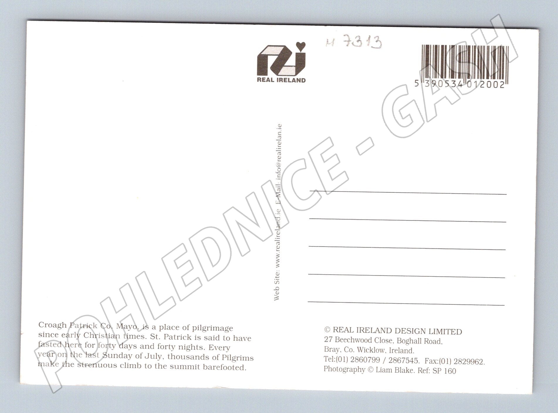 Pohlednice Croagh Patrick, Co. Mayo, Irsko – Na lícní straně je barevná fotografie známé poutní hory Croagh Patrick se sochou svatého Patrika v popředí. Tento vrchol je významným místem křesťanských poutí již od raných křesťanských dob. Svatý Patrik zde podle tradice držel půst čtyřicet dní a čtyřicet nocí. Každoročně poslední červencovou neděli vystupují na vrchol tisíce poutníků, mnozí z nich dokonce bosí. Pohlednice zachycuje krásu irské krajiny i duchovní význam tohoto místa.