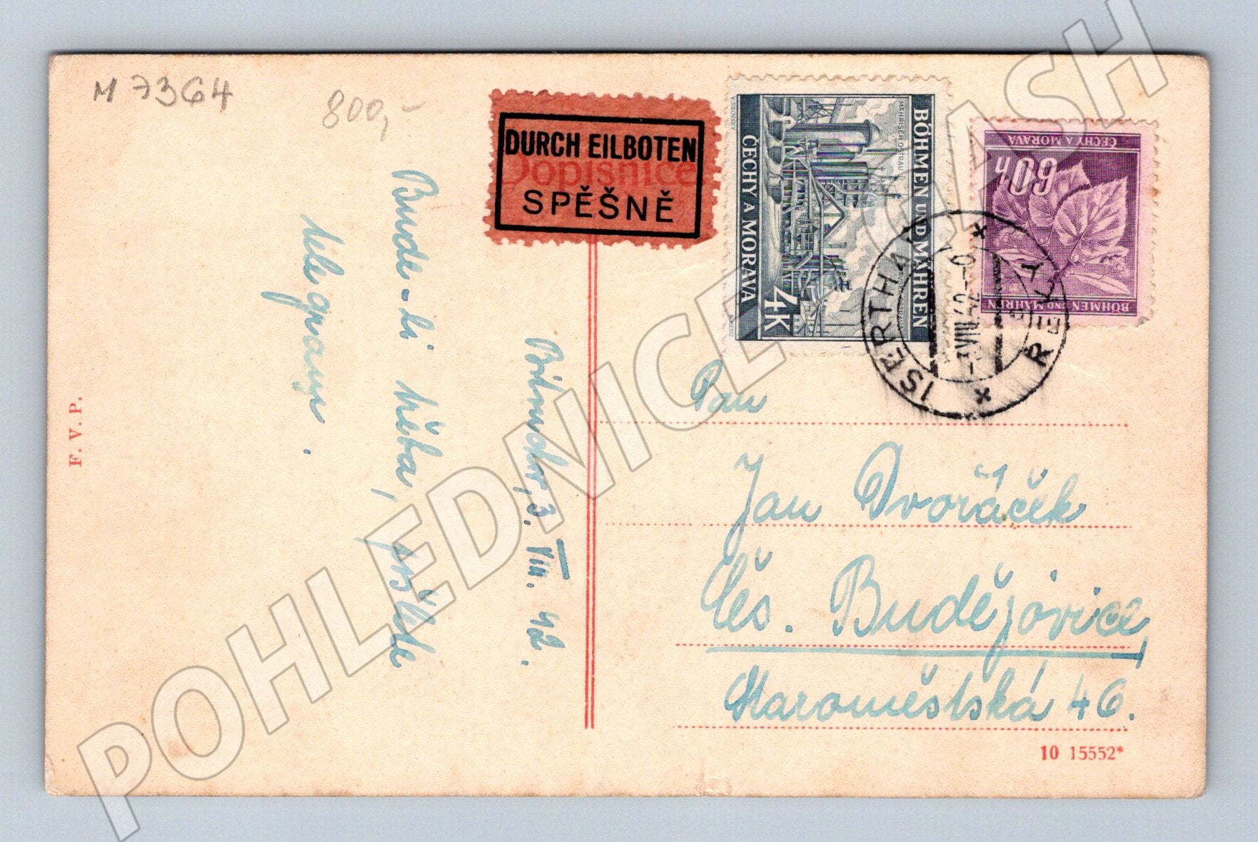 Historická pohlednice ze série Staré n. Kiegrovy stezky zobrazující skalnatou krajinu a železniční trať se zářezy do skály v oblasti mezi Semily a Železným Brodem. Pohlednice je prošlá poštou, s razítkem z období Protektorátu Čechy a Morava, doplněná dobovými známkami včetně označení spěšné zásilky. Na přední straně je detailně vyobrazen železniční tunel i most. Zadní strana obsahuje rukopisný vzkaz a adresu adresáta. Výborný sběratelský stav, autentická dobová atmosféra a zajímavosti z oblasti železnic a železniční architektury v krásné přírodní scenérii Českého ráje.