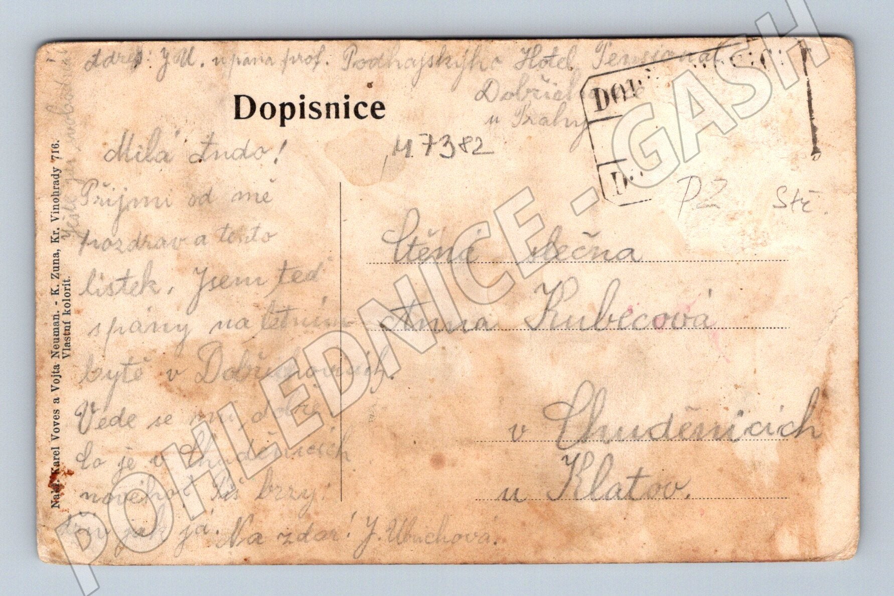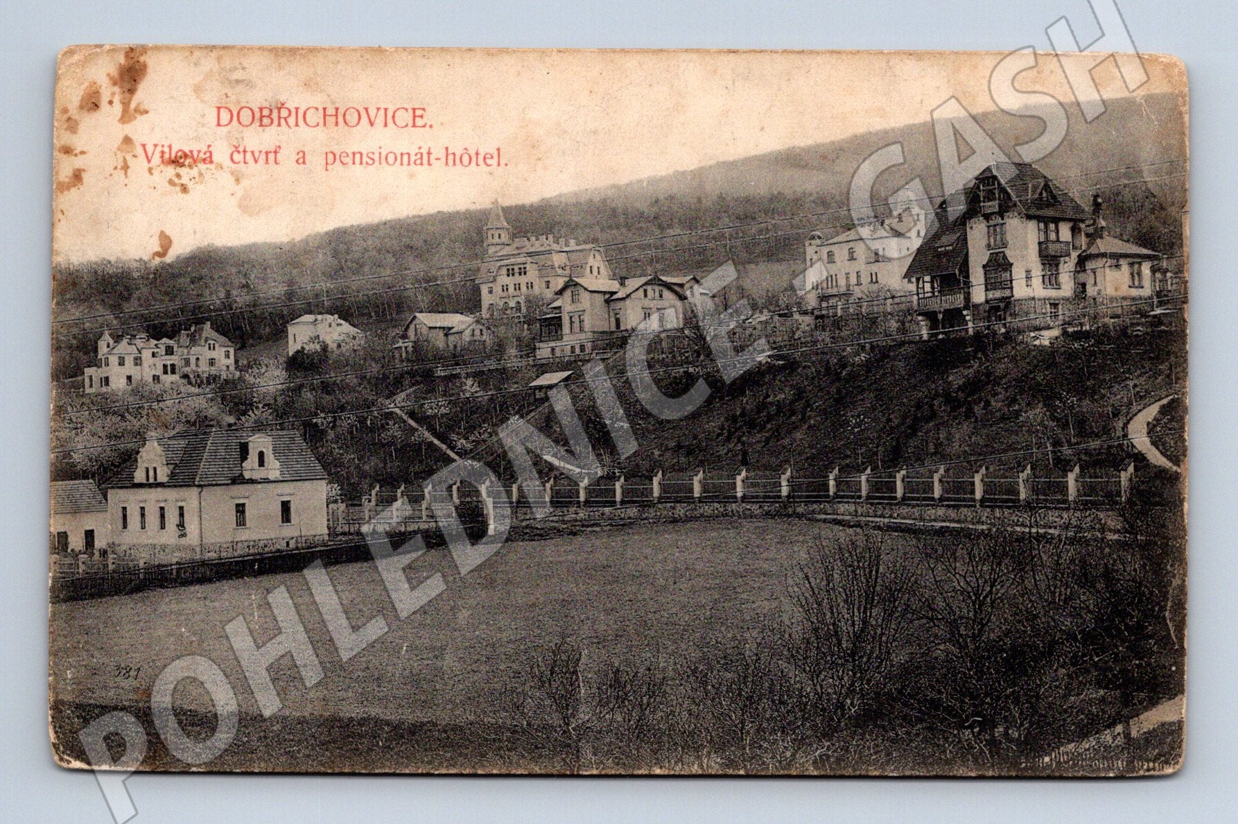 Historická pohlednice z Dobřichovic zachycující vilovou čtvrť a pensionát-hotel. Pohlednice je tištěna v černobílém provedení s výrazným červeným popiskem DOBRICHOVICE. Vilová čtvrť a pensionát-hôtel . Zadní strana nese rukopisný text a adresu určenou slečně v Štěnicích u Klatov. Vydavatel pohlednice: Voves & Vořš Neumann, K. Žuma, Kr. Vinorady, 176. Pohlednice nese stopy stáří, mírné opotřebení a zašpinění, což přidává na její autenticitě a sběratelské hodnotě. Skvělý přírůstek do sbírky historických pohlednic z Čech před rokem 1950.