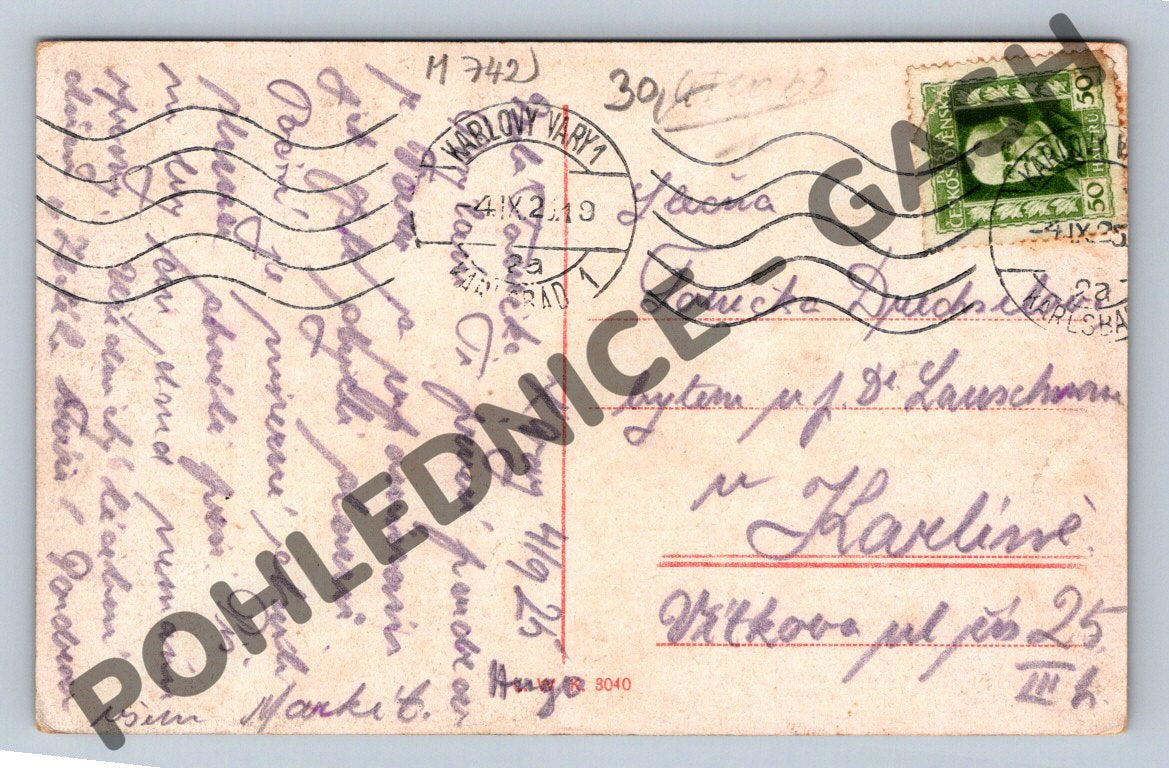 Pohlednice zobrazující historický pohled na Karlovy Vary, konkrétně Křížovou třídu a Mlýnské nábřeží. Barevná reprodukce nabízí detailní pohled na architekturu a atmosféru tohoto lázeňského města. Pohlednice je datována razítkem z roku 1925 a obsahuje poštovní známku Československé republiky s nominální hodnotou 50 haléřů. Pohlednice je vhodná pro sběratele starých pohlednic a milovníky historie Karlových Varů. Stav pohlednice je zachovalý s viditelnými známkami stáří, především na okrajích.