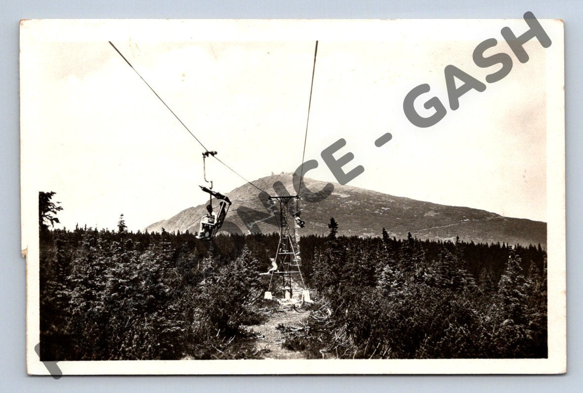 Starší černobílá pohlednice zobrazující lanovku na Sněžku v Krkonoších, která je vyobrazena ve své horní části nad lesem. Pohlednice nabízí zajímavý historický pohled na dopravní zařízení spojující oblasti v pohoří. Pohlednice je použitá, s razítkem a údaji o vyobrazení a výrobcem ORBIS. Velmi vhodná pro sběratele pohlednic s motivem dopravy a horské krajiny.