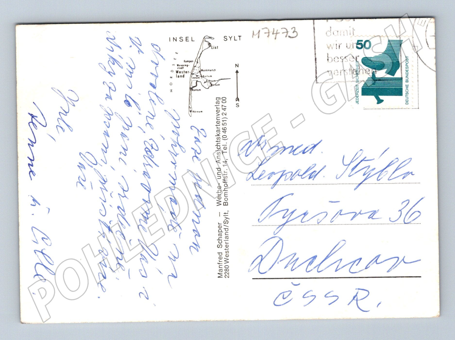 Originální pohlednice se záběry pobřeží a krajiny ostrova Sylt, která byla zaslána z Německa a poštovně orazítkována. Na lícní straně je koláž fotografií s motivy moře, vln, písečných dun a západu slunce spolu s mapou ostrova Sylt. Zadní strana je popsána ručně psaným textem, opatřena známkou a razítkem. Pohlednice je zajímavá pro sběratele tematicky zaměřené na evropskou krajinu, cestování nebo německá přímořská letoviska. Celkový stav dle fotografií, vhodné i jako dárek nebo dekorace na zeď.