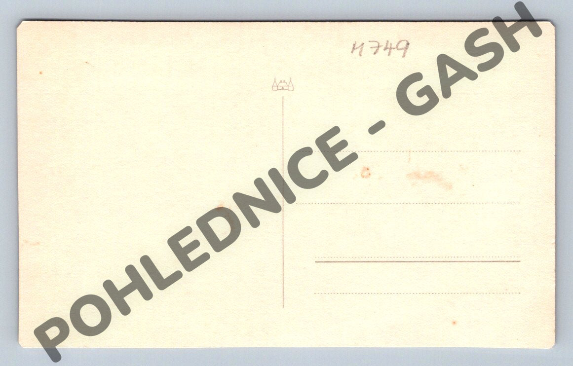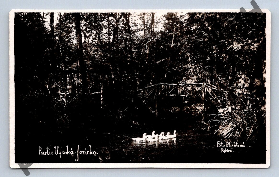Černobílá pohlednice zobrazující malebnou scenérii s jezírkem a lesním koutem. Na obrázku je vidět malý mostek v pozadí a v popředí plující skupinka bílých kachen. Pohlednice je označena nápisem Partie Vysoké jezírko a signovaná Foto Plichta Pečky . Tento starý snímek zachycuje klidnou přírodní atmosféru a je ideální pro sběratele pohlednic s přírodní tematikou či zájmem o historickou fotografii. Pohlednice není razítkována ani neobsahuje žádný text na zadní straně, což zvyšuje její hodnotu jako sběratelský kousek.