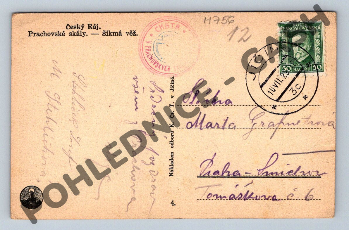 Nabízím hezkou starou pohlednici s motivem Českého ráje, konkrétně Prachovských skal s výraznou Šikmou věží. Pohlednice je datována, s frankaturou Československých známek a razítkem z obce Jičín. Text na zadní straně dokládá osobní adresu a věnování, což přidává na autenticitě a historické hodnotě kousku. Stav dobrý - viditelné opotřebení odpovídá stáří. Ideální sběratelský kousek pro milovníky české krajiny a historie pohlednic.