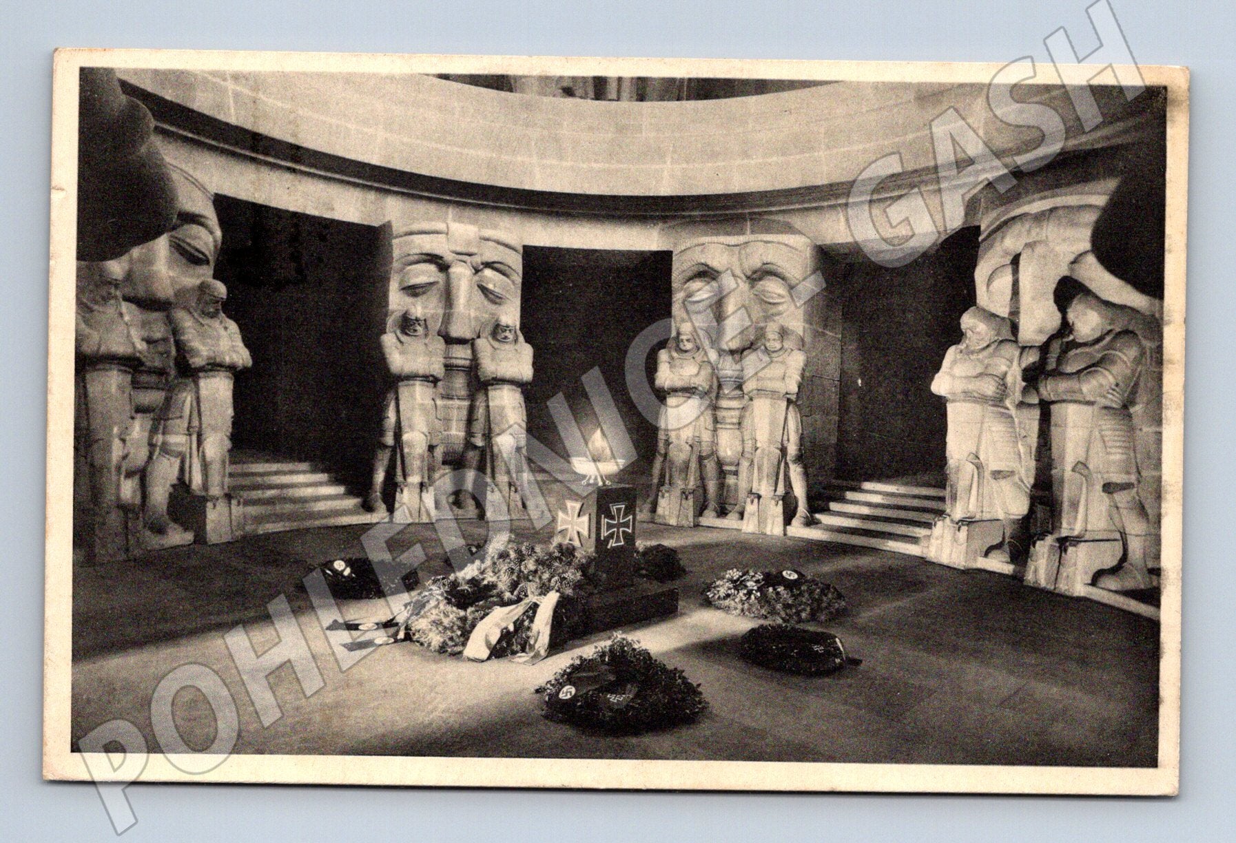 Originální stará pohlednice zobrazující interiér Památníku bitvy národů (Völkerschlachtdenkmal) v Lipsku, Německo. Na pohlednici je vyobrazen monumentální prostor s kamennými sochami bojovníků, věnci a věčným ohněm uprostřed. Jedná se o významný památník postavený na památku bitvy u Lipska z roku 1813. Pohlednice je prošlá poštou, opatřena německou známkou i razítkem, a na zadní straně nese adresu a vlastnoručně psaný vzkaz. Celkový stav odpovídá stáří, vhodné pro sběratele historických pohlednic a zájemce o evropské památky. Třetí říše svastika nacisti polní pošta