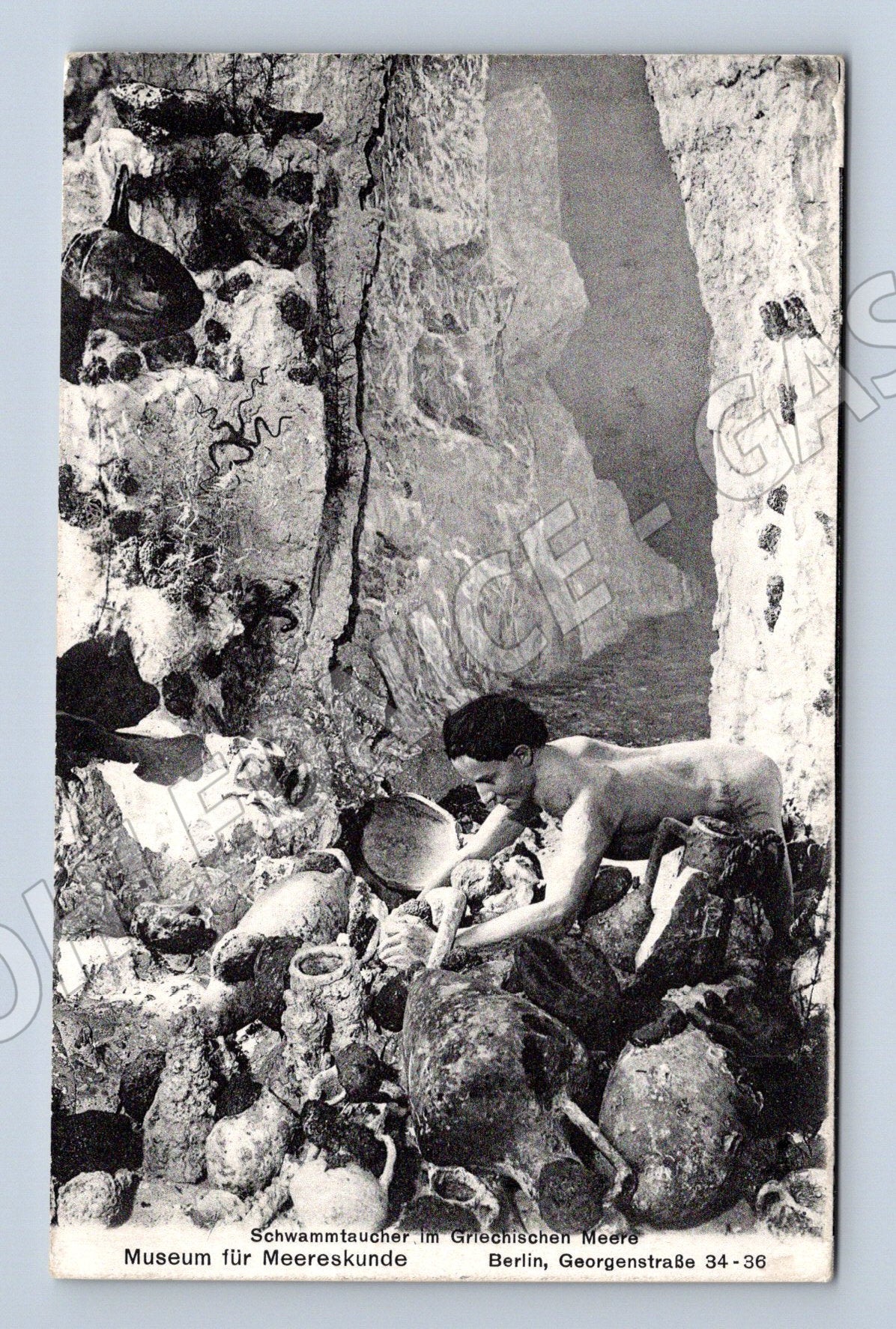Originální černobílá pohlednice ilustrující podmořského potápěče mezi amforami a dalšími artefakty na dně moře. Na levém okraji je popis: Museum für Meereskunde, Schwammtaucher im Griechischen Meere, Berlin, Georgenstraße 34-36. Pohlednice zobrazuje výjev mořského sběrače v Egejském moři a pochází z období začátku 20. století. Z druhé strany je ručně psaný text, stará známka a poštovní razítko z Německé říše. Atraktivní kus pro sběratele motivů moře, podmořského světa či dopravy. Stav dle scanů, historický originál.