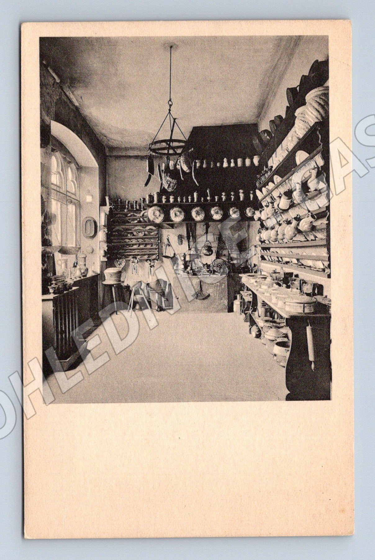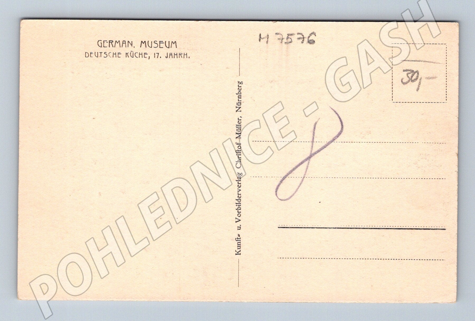 Originální stará pohlednice zobrazující interiér německé kuchyně ze 17. století. Jedná se o tematickou pohlednici z expozice German Museum (Deutsche Küche, 17. Jahrh.), na které je detailně zachycena autentická dobová kuchyně s historickým vybavením, nádobím a dekoracemi. Zadní strana pohlednice je čistá, bez textu a známky. Vydavatel: Chrltof Müller, Nürnberg. Pohlednice je ve velmi dobrém stavu, vhodná pro sběratele nebo jako dekorace. Formát klasický.